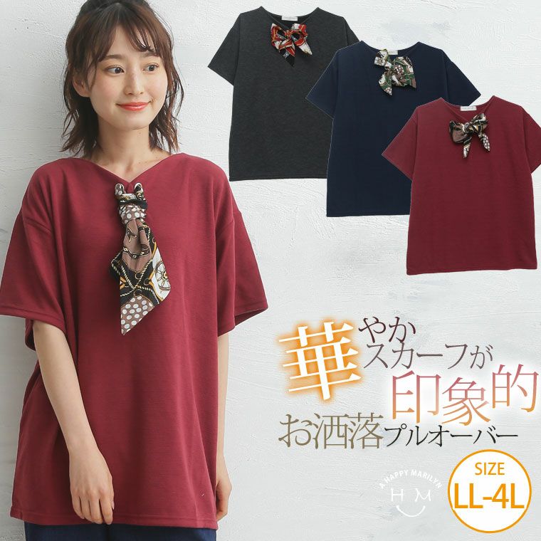 ゆったりなのにスッキリ見せるスカーフ付きデザインプルオーバー