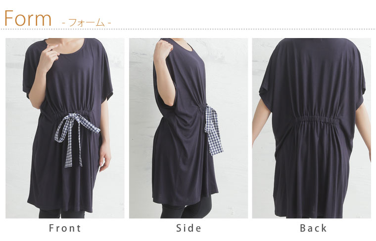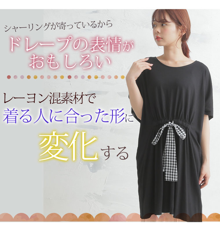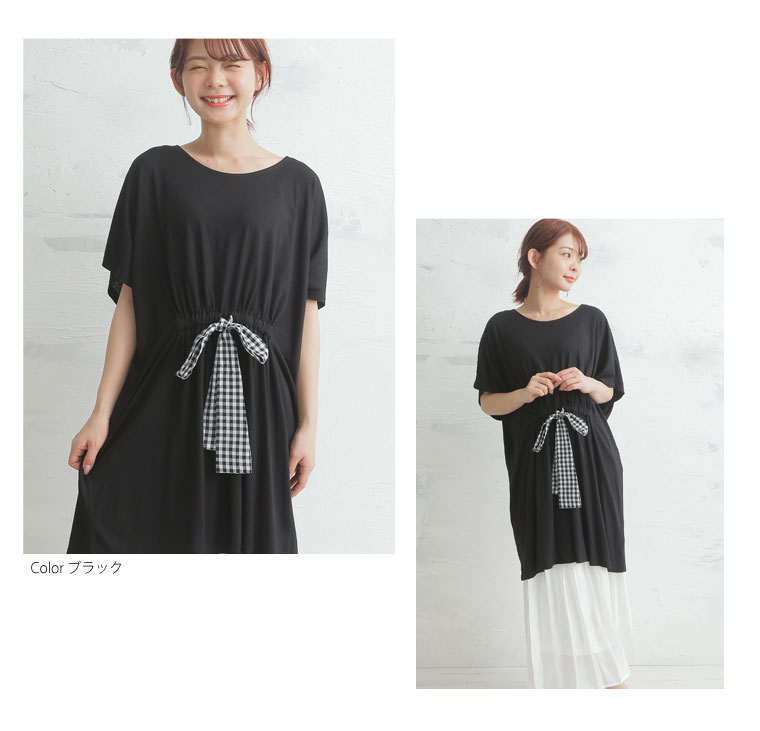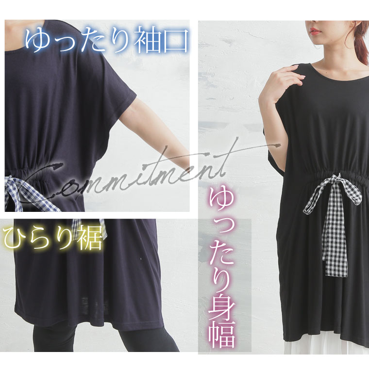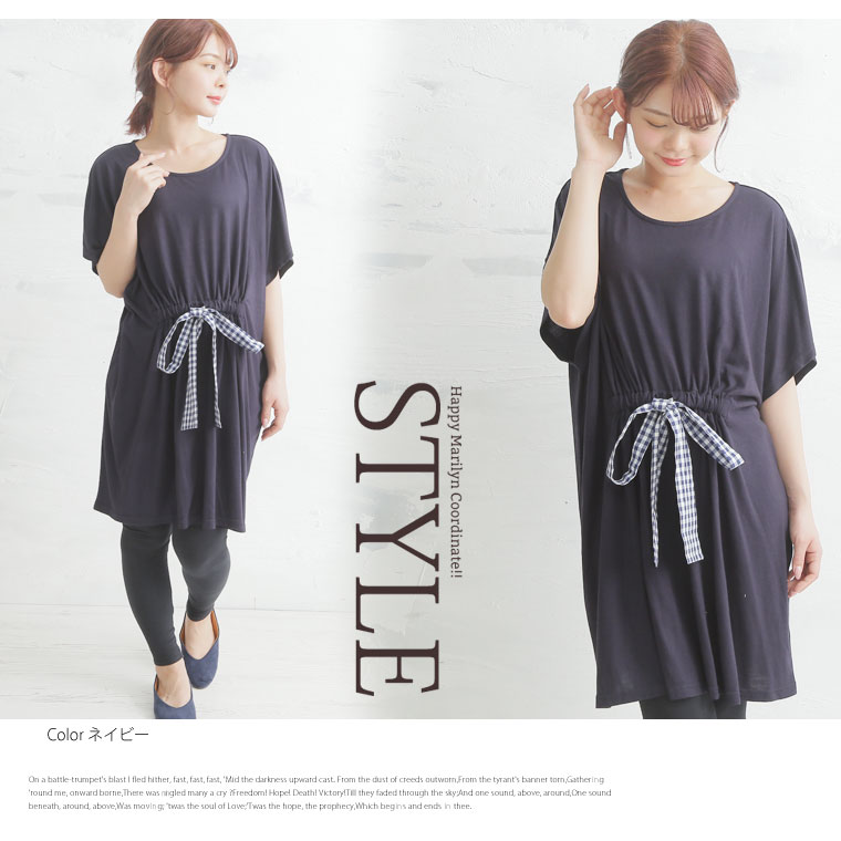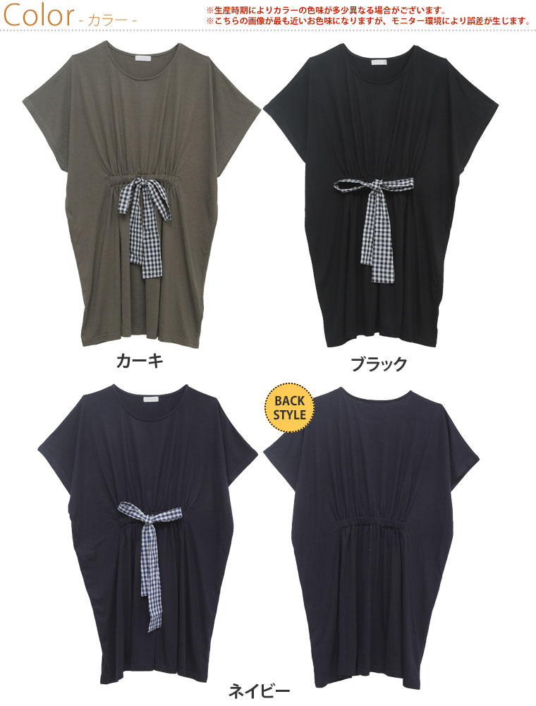 4. 大きいサイズ ウエスト ギンガム柄 リボン チュニック