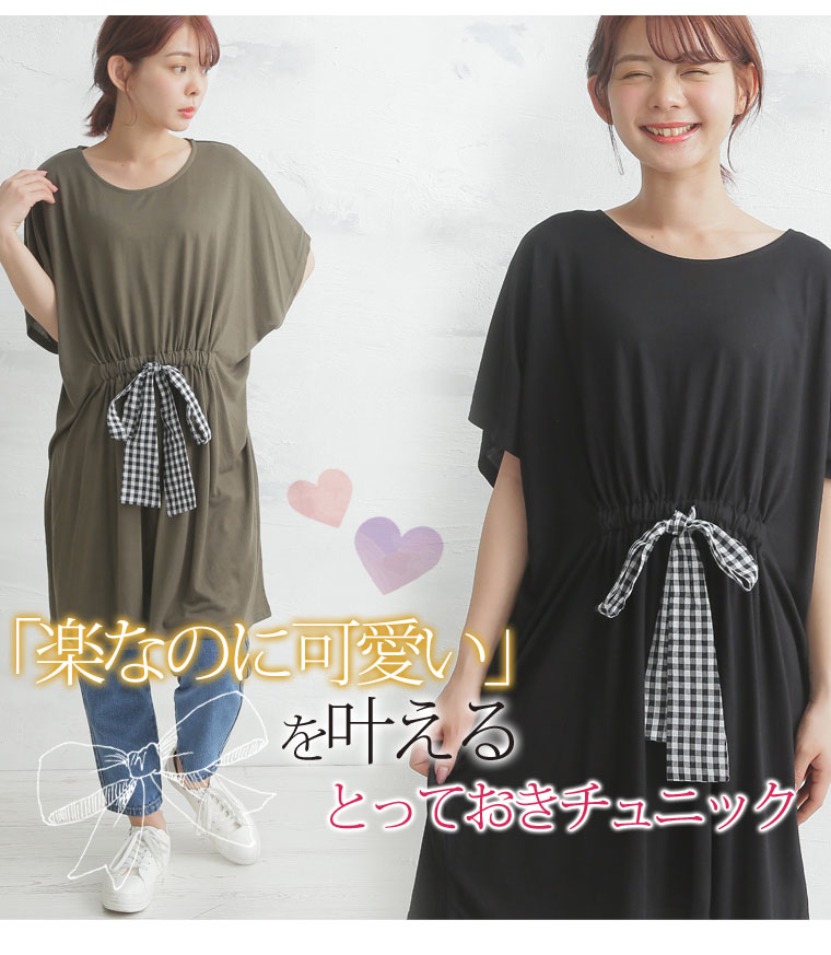 大きいサイズ ウエスト ギンガム柄 リボン チュニック