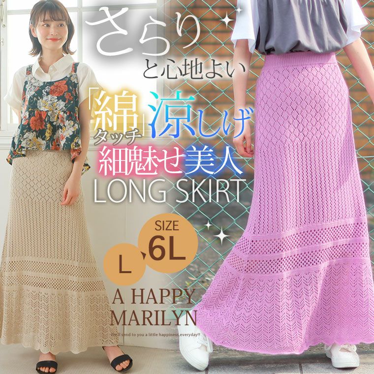 他の画像を見る オリジナル スカート ボトムス LL 3L 4L 5L 6L 夏 夏物 夏服 夏用 綿 ニット サマーニット ゆったり お腹 お尻 腰周り さらりと心地よい 涼やか 透かし編み 綿混 美人 ロング フレアスカート | 大きいサイズの通販ならハッピーマリリン 在庫特価 定価 ¥ 2,990 のところ 価格 ¥ 999 税込 3.96 お気に入りに登録する