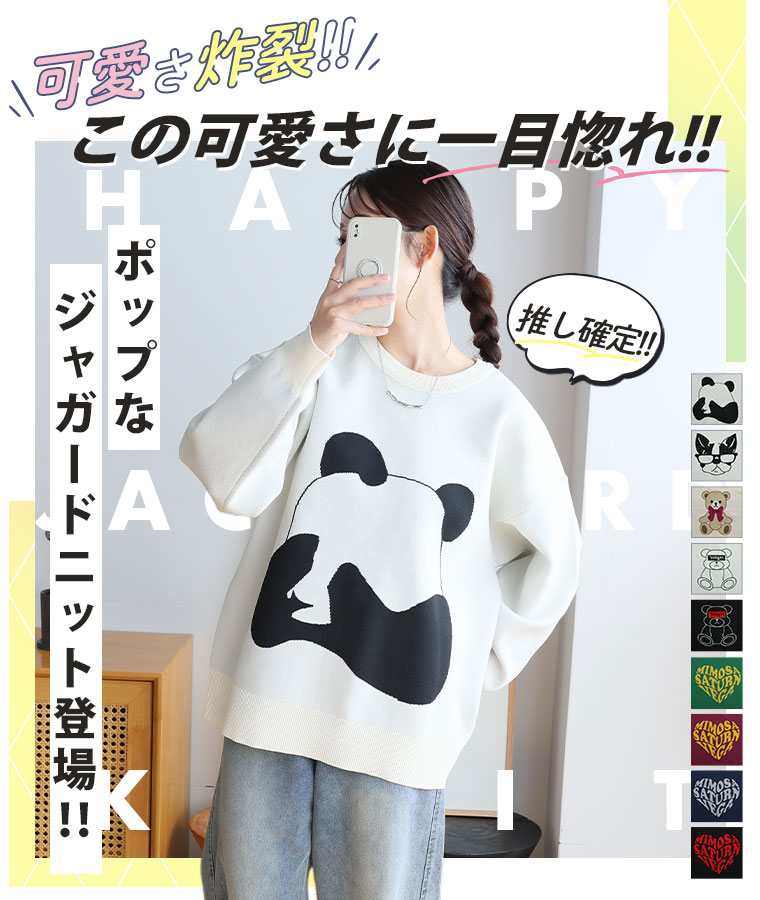 ニット セーター LL 3L 4L 5L 6L 長袖 冬 冬物 冬服 ぽっちゃり ゆったり 軽い パンダ イヌ クマ ハート ロゴ 柄が選べる! 可愛さ炸裂!! 選んで楽しい!! ハッピージャガード ゆるニット
