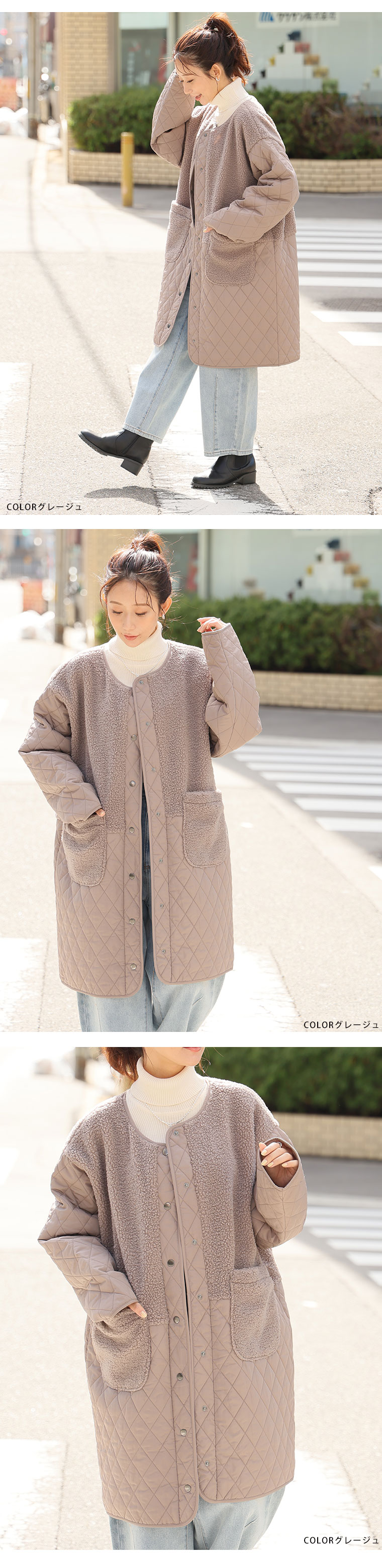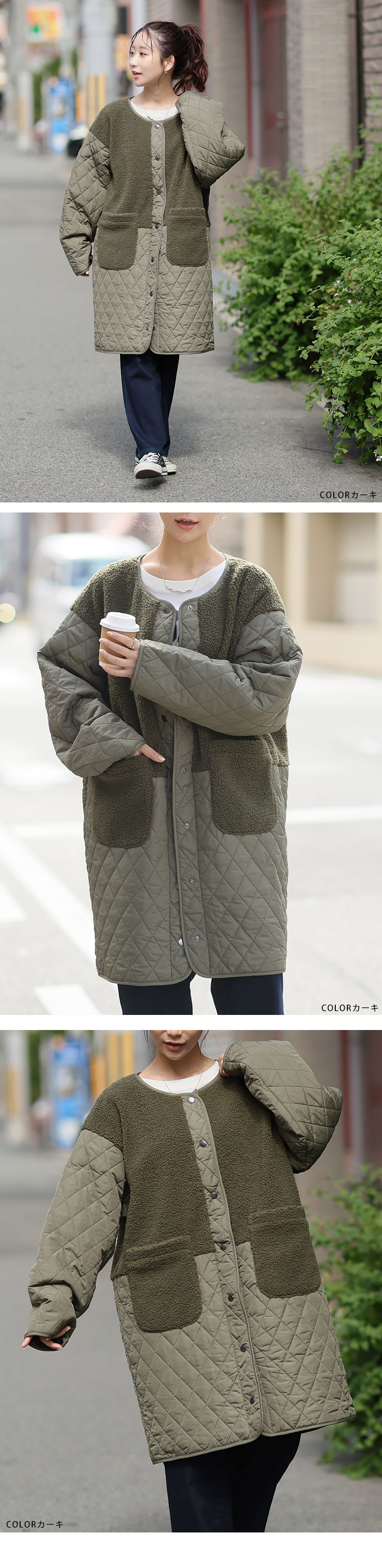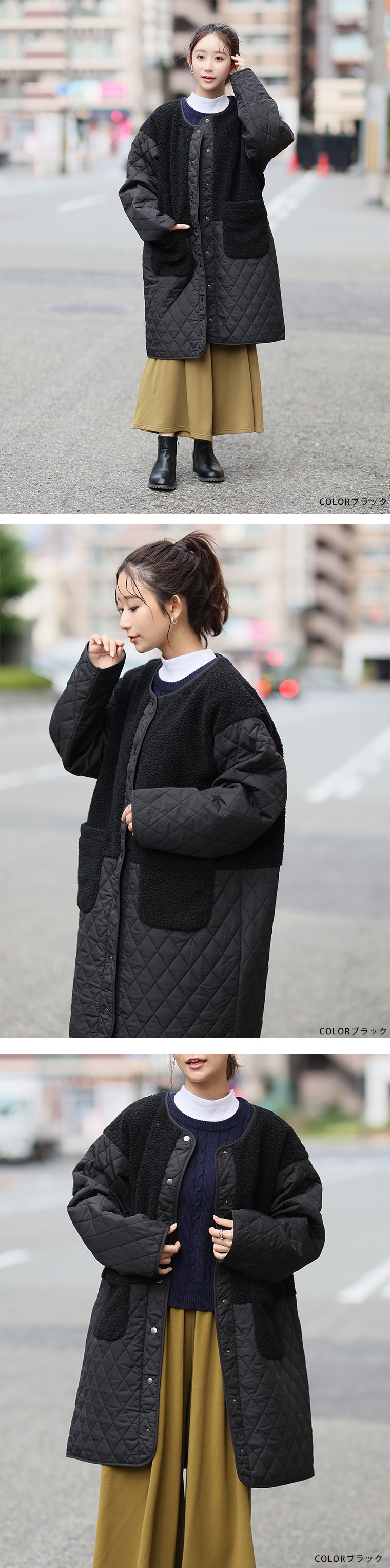 3. 大きいサイズ 軽い! 厚すぎない! 細魅せ切替 ボア切替え ダイヤキルティング コート 軽量