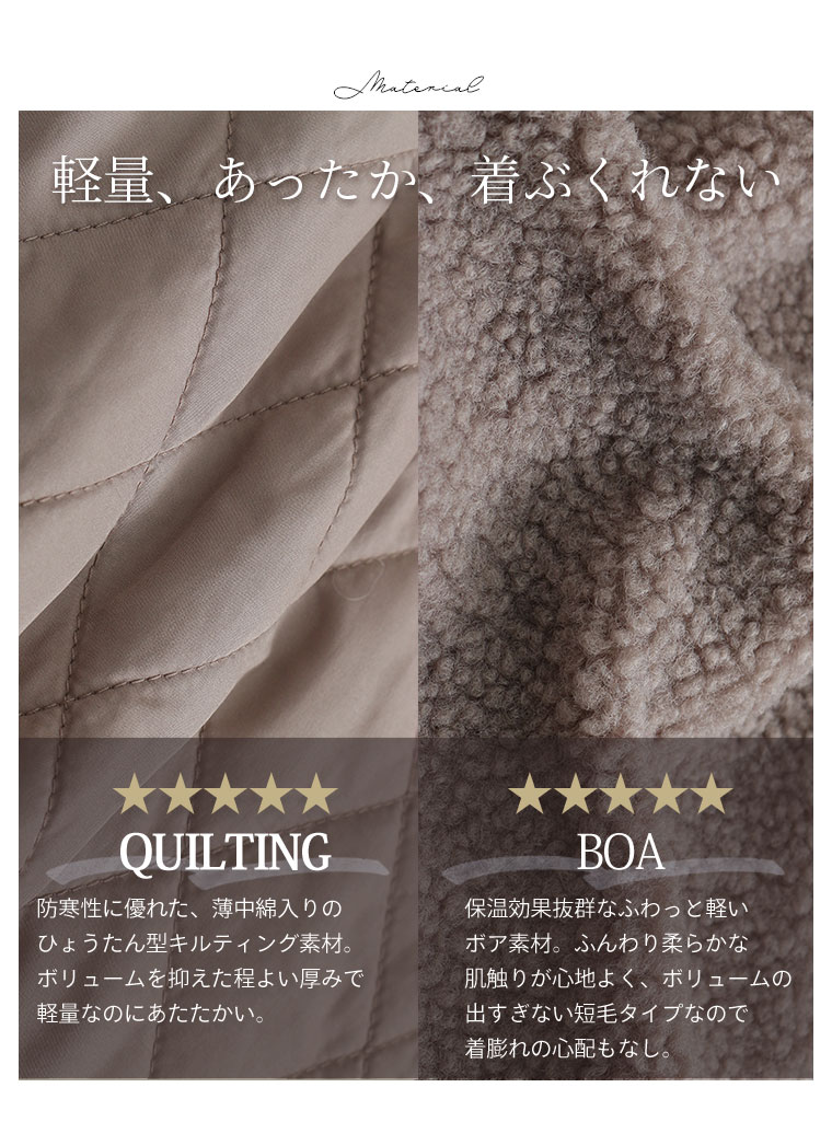 4. 大きいサイズ 軽い! 厚すぎない! 細魅せ切替 ボア切替え ダイヤキルティング コート 軽量