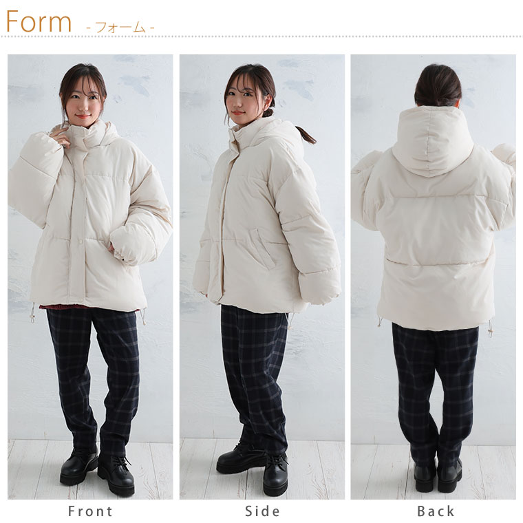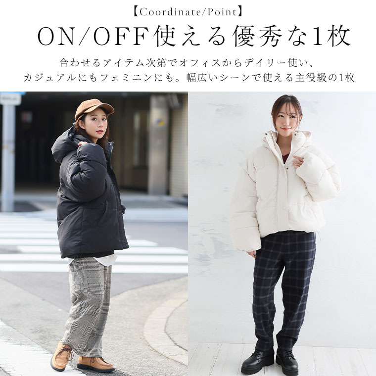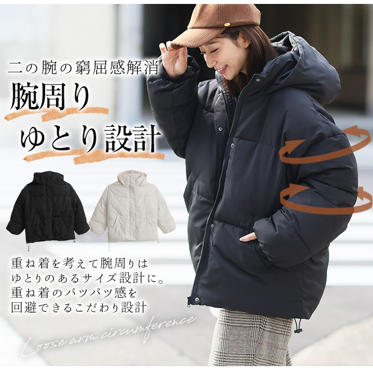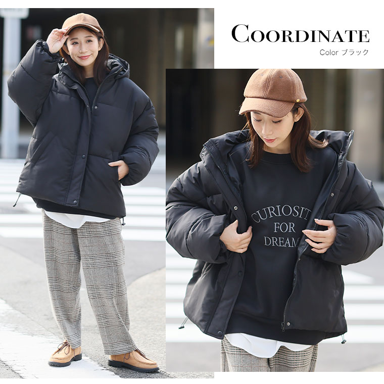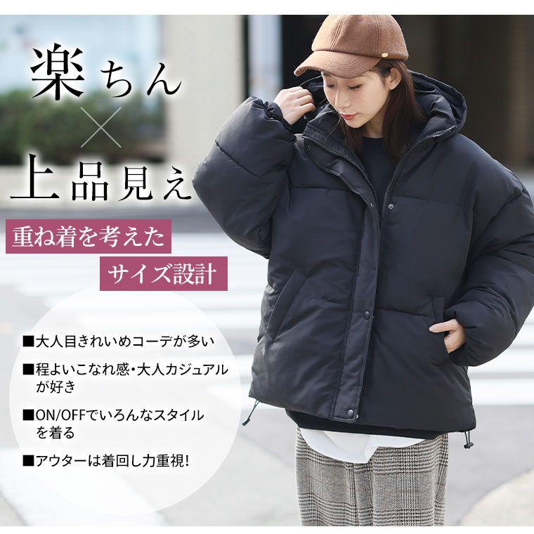シンプルな黒の中綿アウターです。写真の通り、しっかり厚みがあってふんわり暖かいです。 全体的にゆったりめのシルエットで、オーバーサイズ好きにはぴったり。 フードも大きめで小顔効果があり、顔まわりを包み込んでくれる感じが◎。立ち上がりもきれいです。着用したときに後ろに垂れ下がらず、首周りに立体的に、かつ形良く収まります。 重たすぎず軽く羽織れるのに、風を通さないので、これからの季節、お出かけや通勤に活躍期待。 ダウンなので、ボリュームがそれなりに出ます。スッキリ見せたい人には向かないかも。 170センチ体重68キロの私が着用して、お尻が隠れるくらいの丈感。肩のラインが少し落ちていて、袖や身幅にも余裕があるので、中に多少厚いニットを着ても窮屈にならないし、腕を動かしてもゴワつきにくいと感じました。 ボトムは、スカートよりもスキニーやパンツと合わせたときのほうが全体のバランスが取りやすく綺麗に見えました。