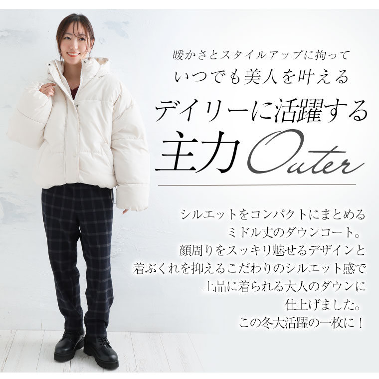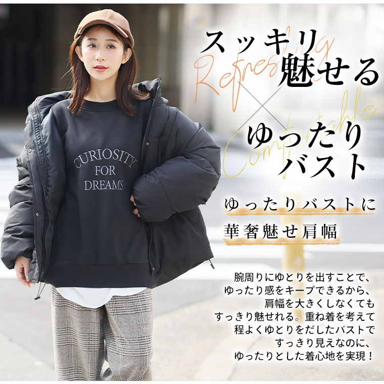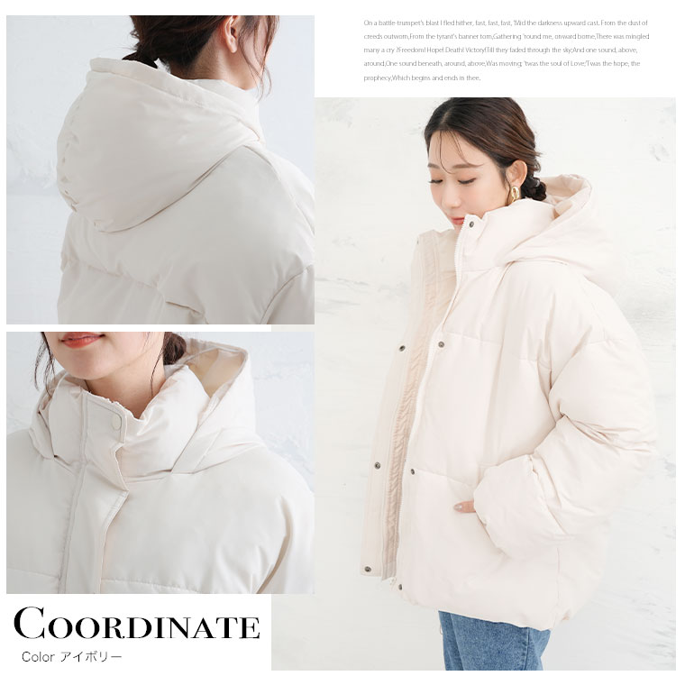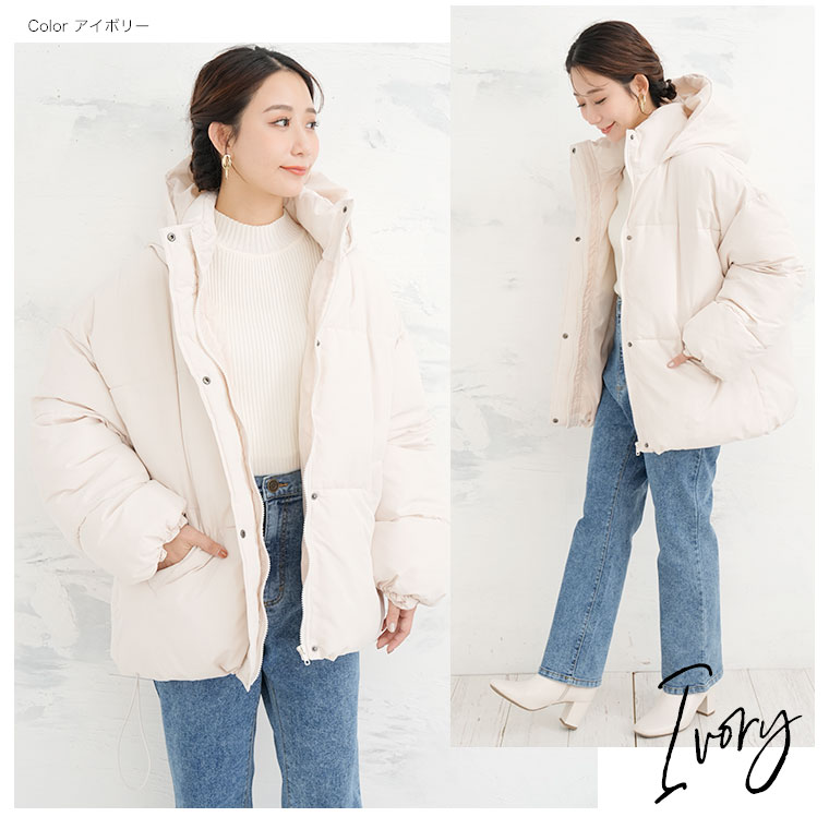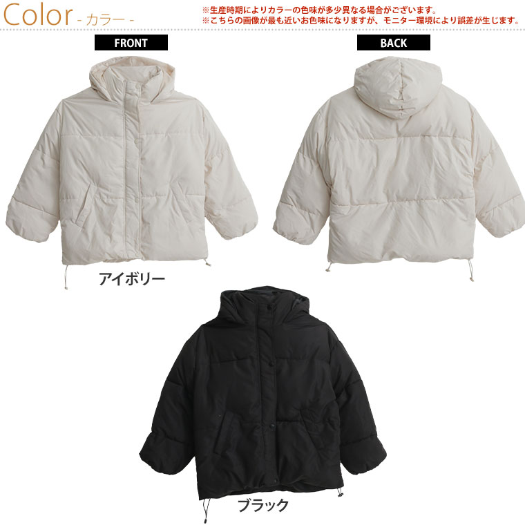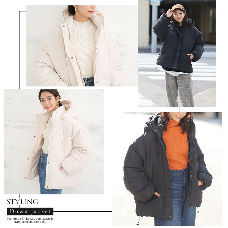 シンプルな黒の中綿アウターです。写真の通り、しっかり厚みがあってふんわり暖かいです。 全体的にゆったりめのシルエットで、オーバーサイズ好きにはぴったり。 フードも大きめで小顔効果があり、顔まわりを包み込んでくれる感じが◎。立ち上がりもきれいです。着用したときに後ろに垂れ下がらず、首周りに立体的に、かつ形良く収まります。 重たすぎず軽く羽織れるのに、風を通さないので、これからの季節、お出かけや通勤に活躍期待。 ダウンなので、ボリュームがそれなりに出ます。スッキリ見せたい人には向かないかも。 170センチ体重68キロの私が着用して、お尻が隠れるくらいの丈感。肩のラインが少し落ちていて、袖や身幅にも余裕があるので、中に多少厚いニットを着ても窮屈にならないし、腕を動かしてもゴワつきにくいと感じました。 ボトムは、スカートよりもスキニーやパンツと合わせたときのほうが全体のバランスが取りやすく綺麗に見えました。