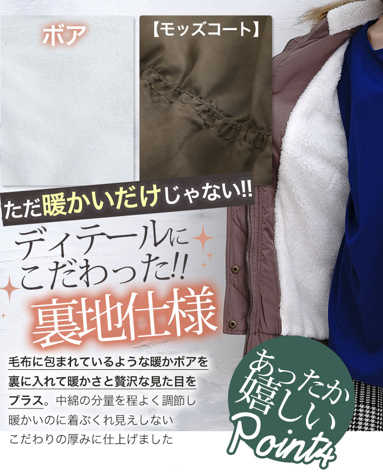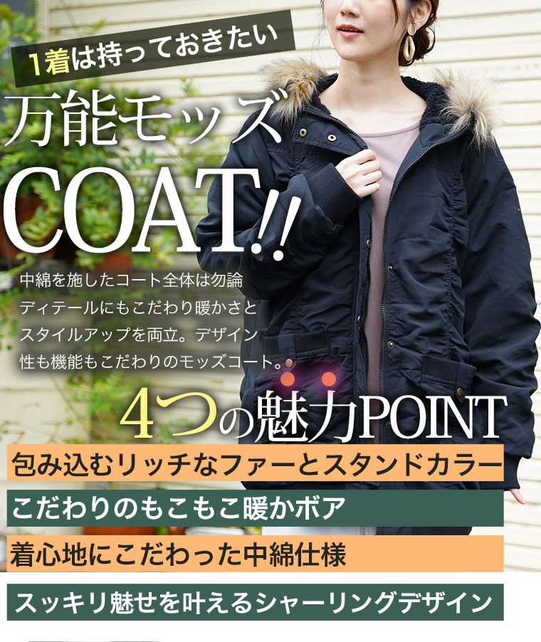 裏ボア使いで着心地暖か。裾リブ使いで着回しやすい、この冬に着たいモッズコート