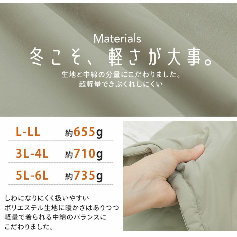 他の画像を見る コート LL 3L 4L 5L 6L 7L 8L 長袖 秋 秋物 秋服 冬 冬物 冬服 ぽっちゃり ゆったり プラスサイズ 中綿 軽量 暖かい キルティングジャケット 軽・薄・シンプル 万能 キルトジャケット | 大きいサイズの通販ならハッピーマリリン 価格 ¥ 4,990 税込 4.21 お気に入りに登録する