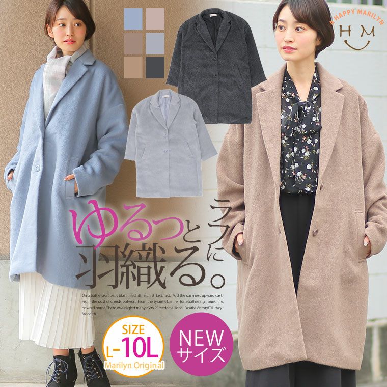 他の画像を見る オリジナル アウター LL 3L 4L 5L 6L 7L 8L 9L 10L お尻 胸周り サイズ追加!! シャギー素材 長袖 ゆるめ チェスターコート | 大きいサイズの通販ならハッピーマリリン 価格 ¥ 5,490 税込 4.45 在庫切れ お気に入りに登録する