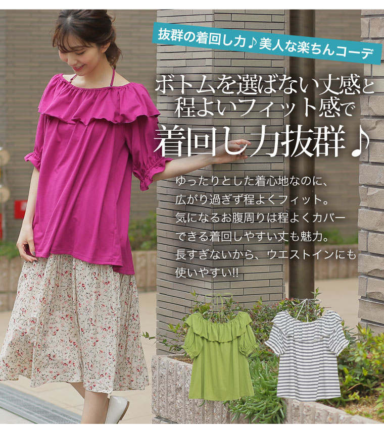 ゆったり着用できました。おしりが全部隠れる丈の長さで、袖は二の腕も隠れてうれしいです。オフショルダーにしても苦しくなく楽ちんに着用できてうれしいですね♪