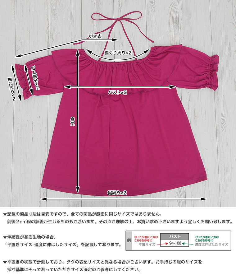サイズ単位:cm 身丈 バスト 襟ぐり周り ゆき丈 ゴム部分/袖口周り 裾周り 素材/透け感