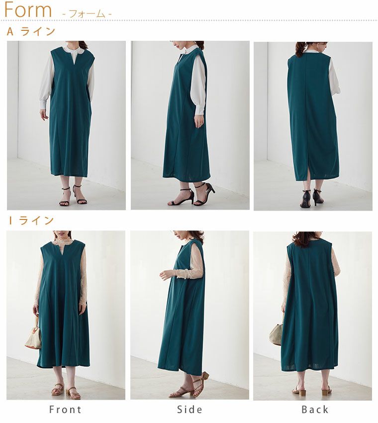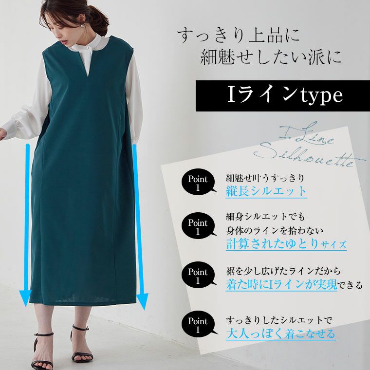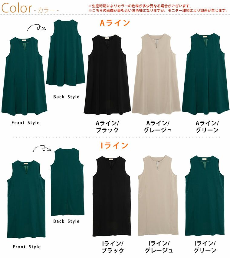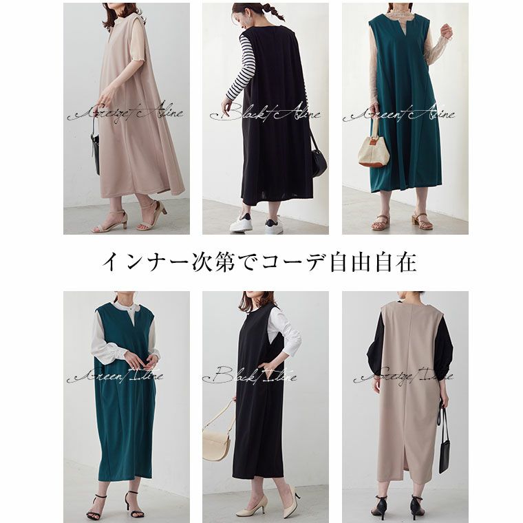 ひんやり涼しく汗かいても気にならないイージーケア選べるシルエットキーネックジャンスカ