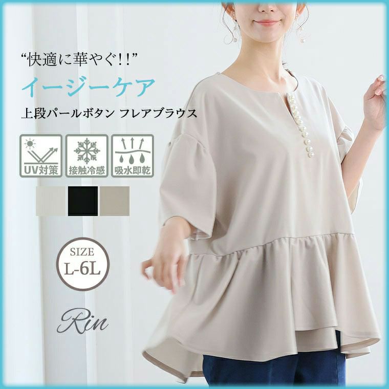 イージーケアで快適に華やぐ!上品パールボタンフレアブラウス