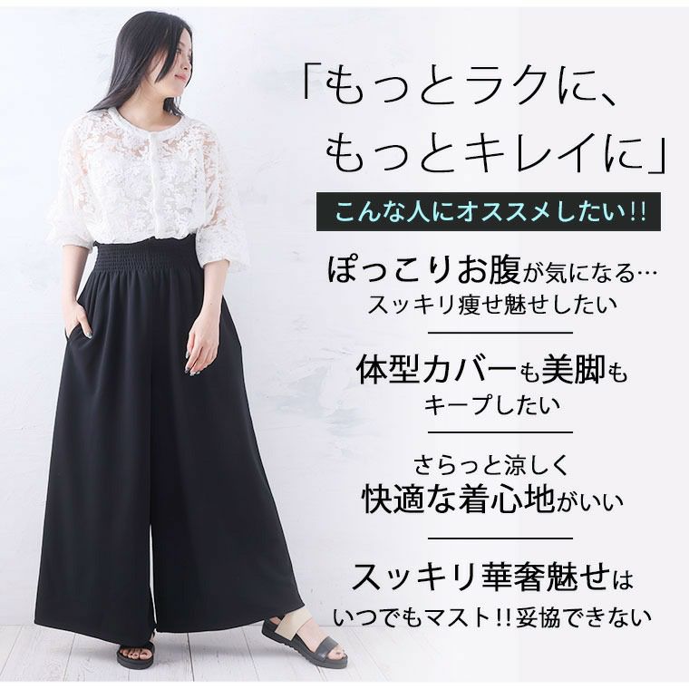 他の画像を見る ボトムス ワイドパンツ LL 3L 4L 5L 6L 夏 夏物 夏服 夏用 ぽっちゃり ゆったり プラスサイズ お腹 太もも 胸周り お尻 腰周り 接触冷感 楽してひんやり! お腹魅せ 接触冷感 ウエストシャーリング ワイドパンツ【ウェストゴム】【ストレッチ】 | 大きいサイズの通販ならハッピーマリリン SALE 定価 ¥ 2,790 のところ 価格 ¥ 1,394 税込 3.56 お気に入りに登録する