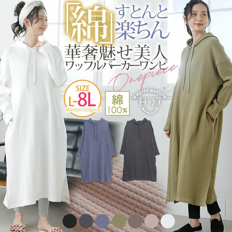 綿100% すとんと楽ちん 華奢魅せ美人USAワッフルロングパーカーワンピース