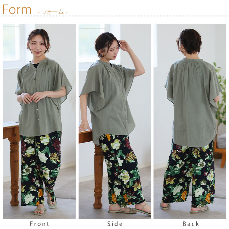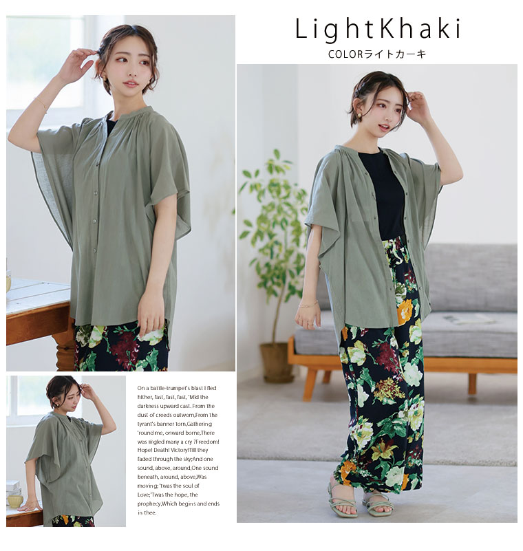 長めの丈感なので、チュニックワンピースのように着ていただいたり、羽織りとしても使えるブラウス