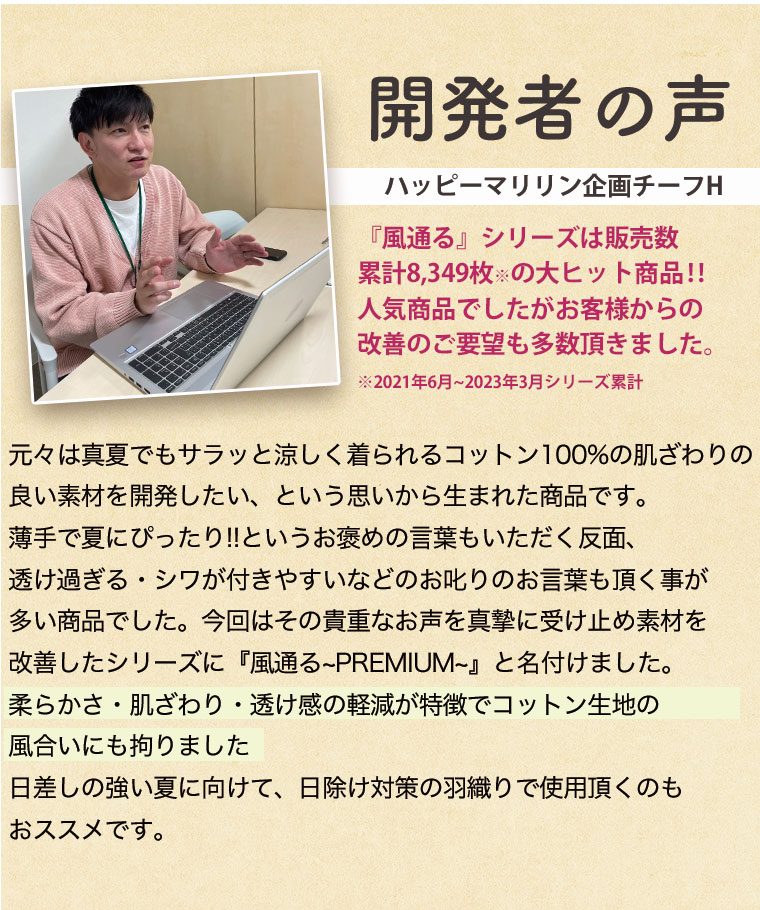 サラサラと軽く、暑い夏は無敵です。汗をかいても乾燥が早く、着心地がとても良い。つい触っちゃいます。