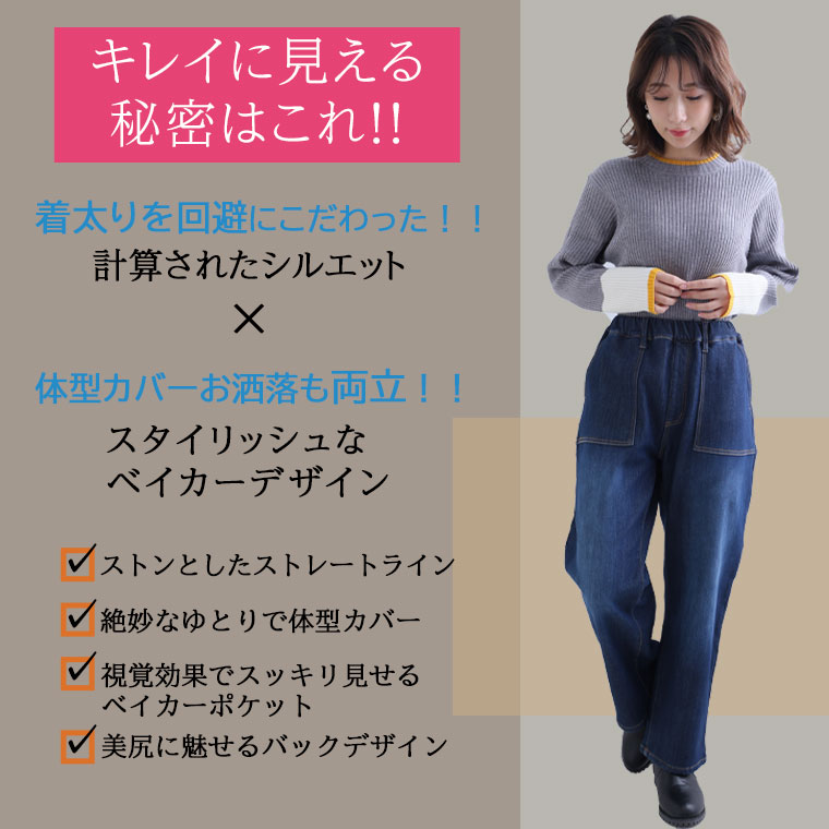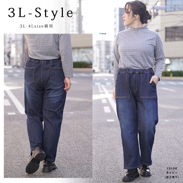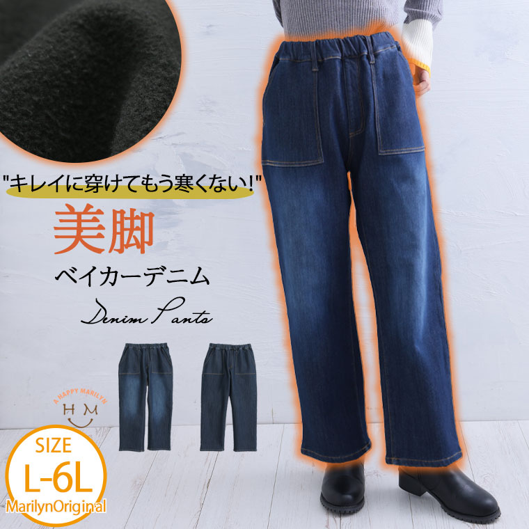 オリジナル ボトムス ベイカーパンツ LL 3L 4L 5L 6L 冬 冬物 冬服 ぽっちゃり ゆったり 裏起毛 かわいい カジュアル ナチュラル プラスサイズ 防寒 暖か 裏フリース 美脚 ベイカー デニムパンツ【ストレッチ】【ウェストゴム】