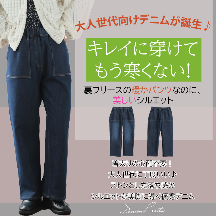 大きいサイズ 防寒 暖か 裏フリース 美脚 ベイカー デニムパンツ【ストレッチ】【ウェストゴム】