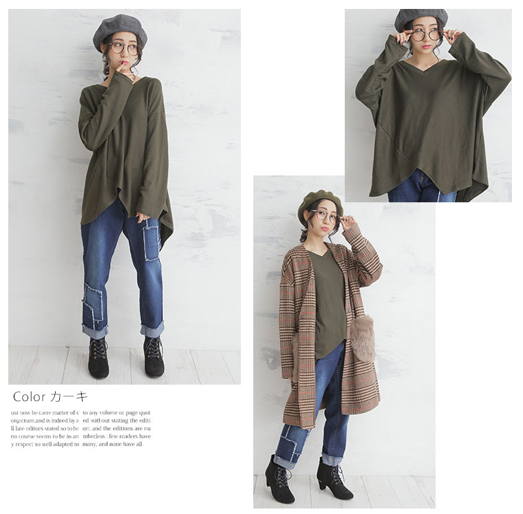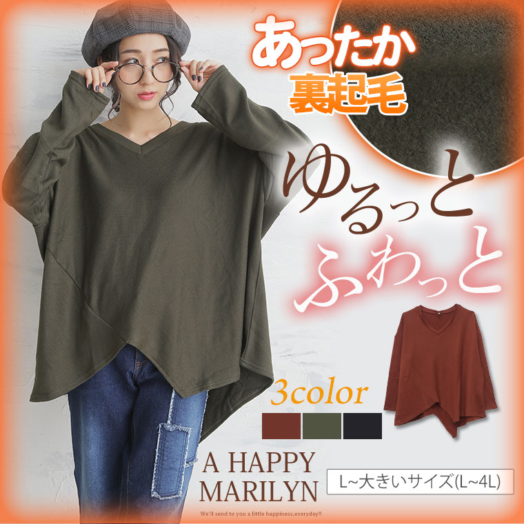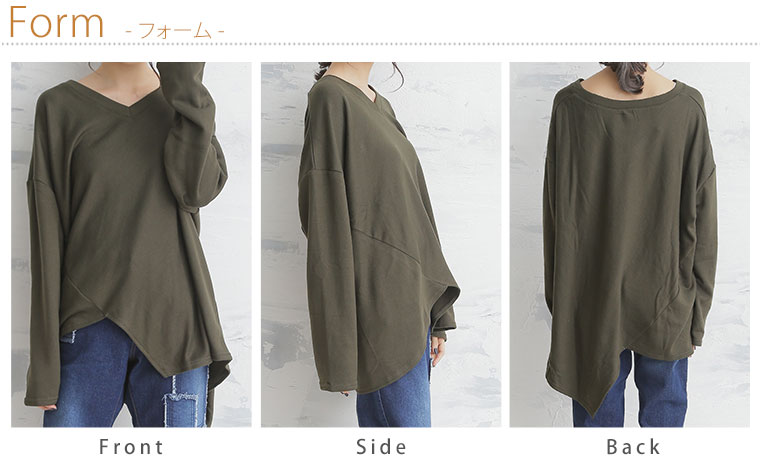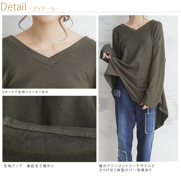 裾がアシンメトリーデザインでさりげなく体型カバー効果のある裏起毛長袖プルオーバー