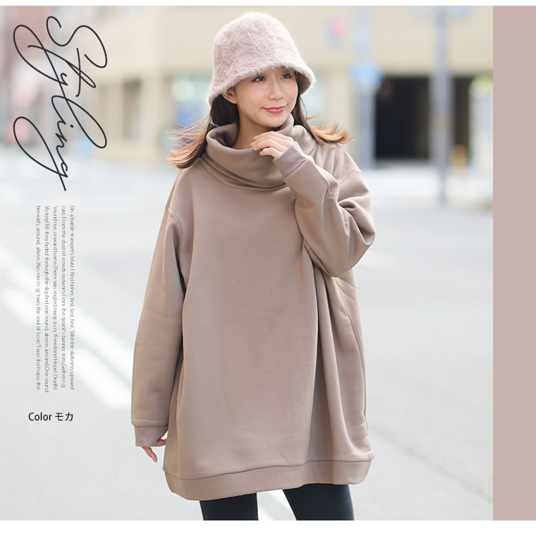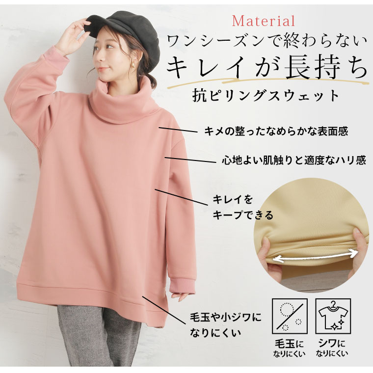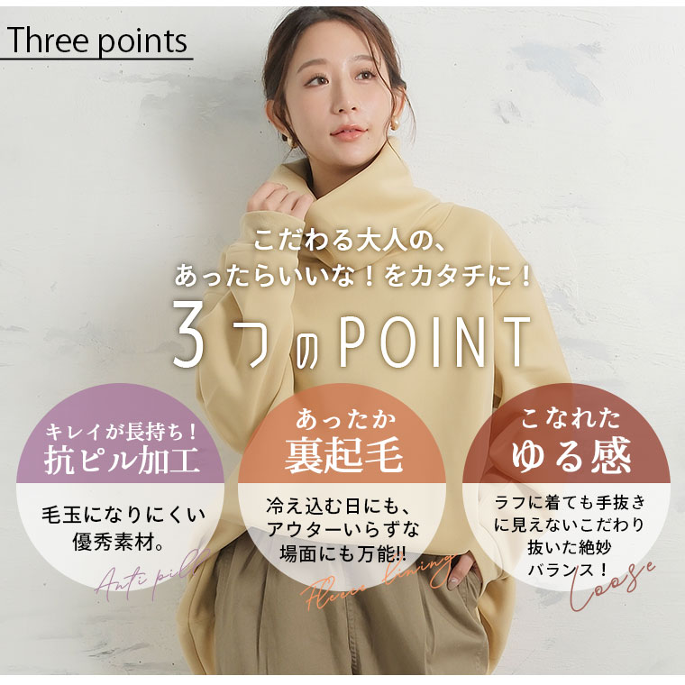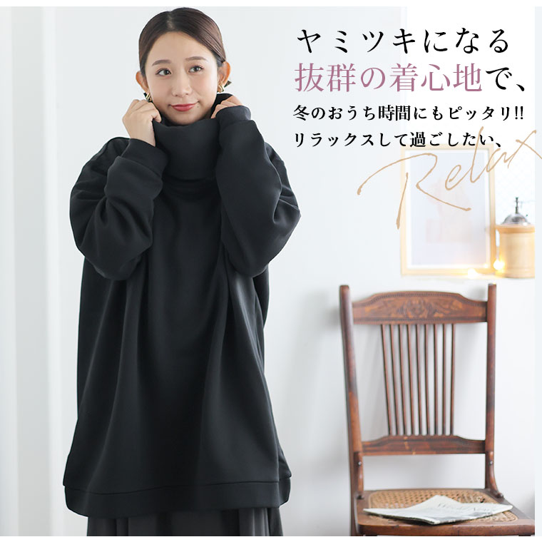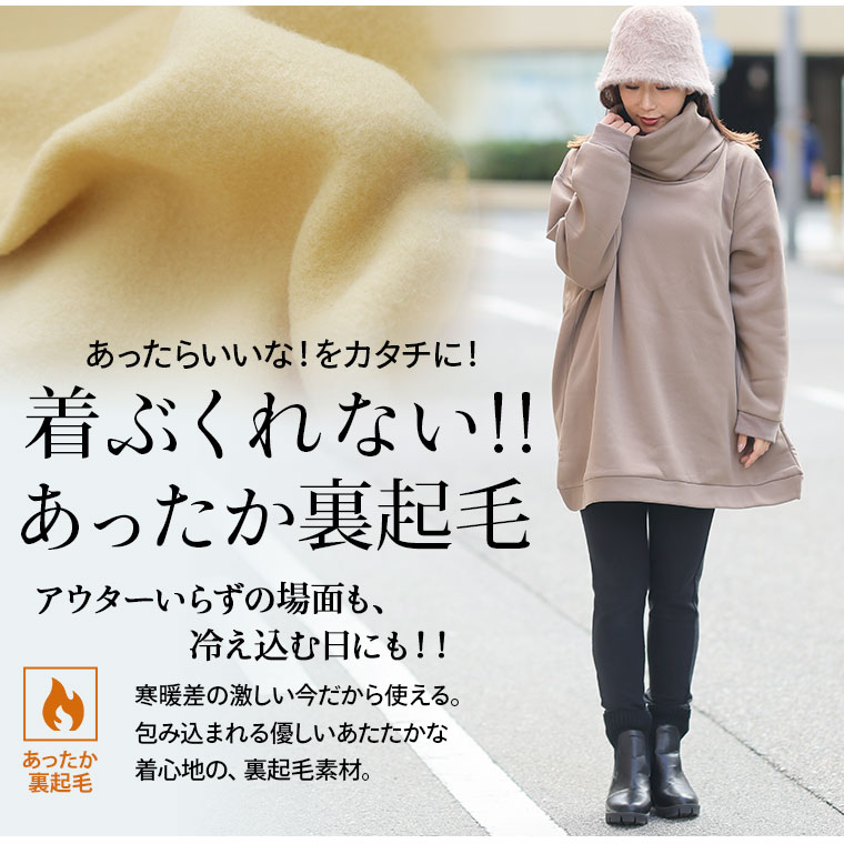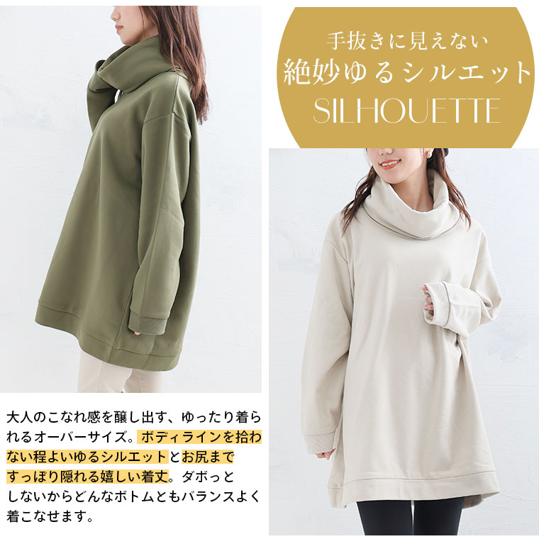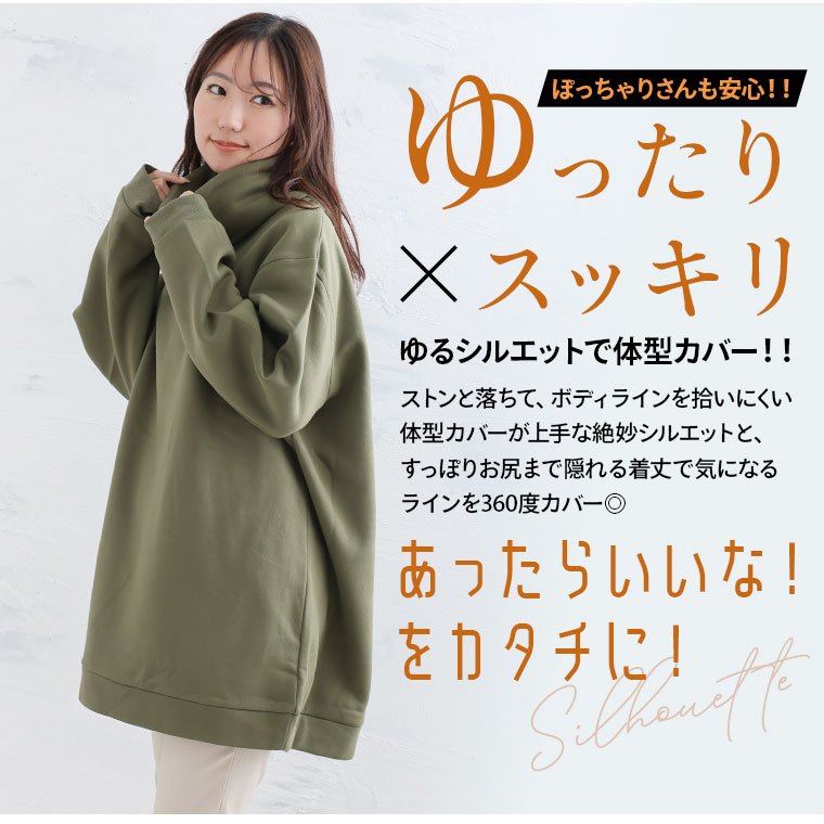包み込まれる優しいあたたかな着心地の、裏起毛素材。ゆるシルエットで体型カバー!