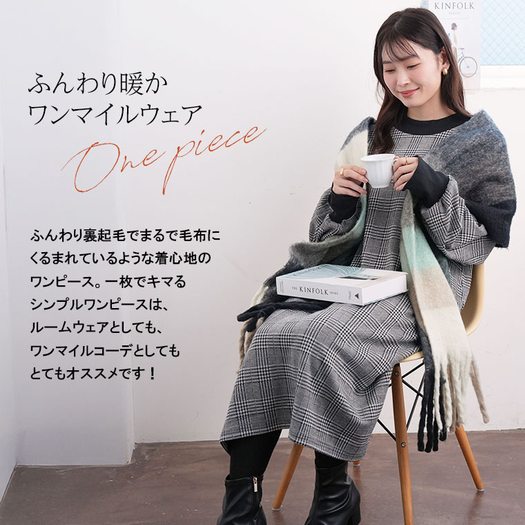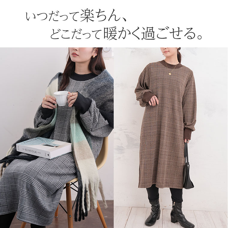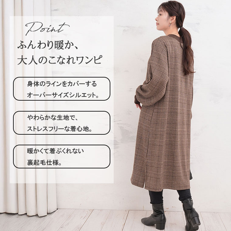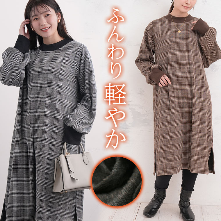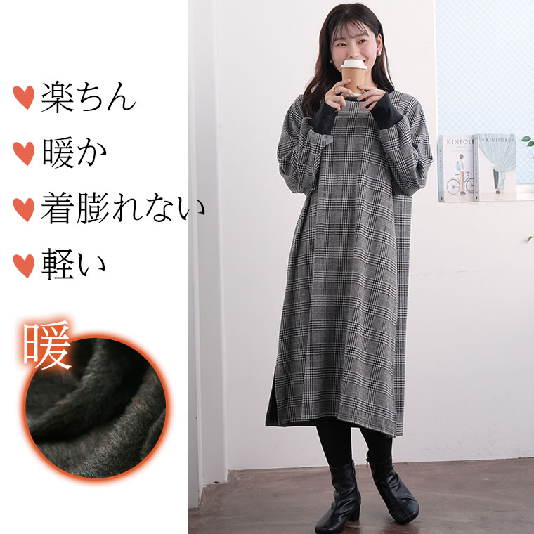 着ぶくれない裏起毛、チェック柄ワンピース。