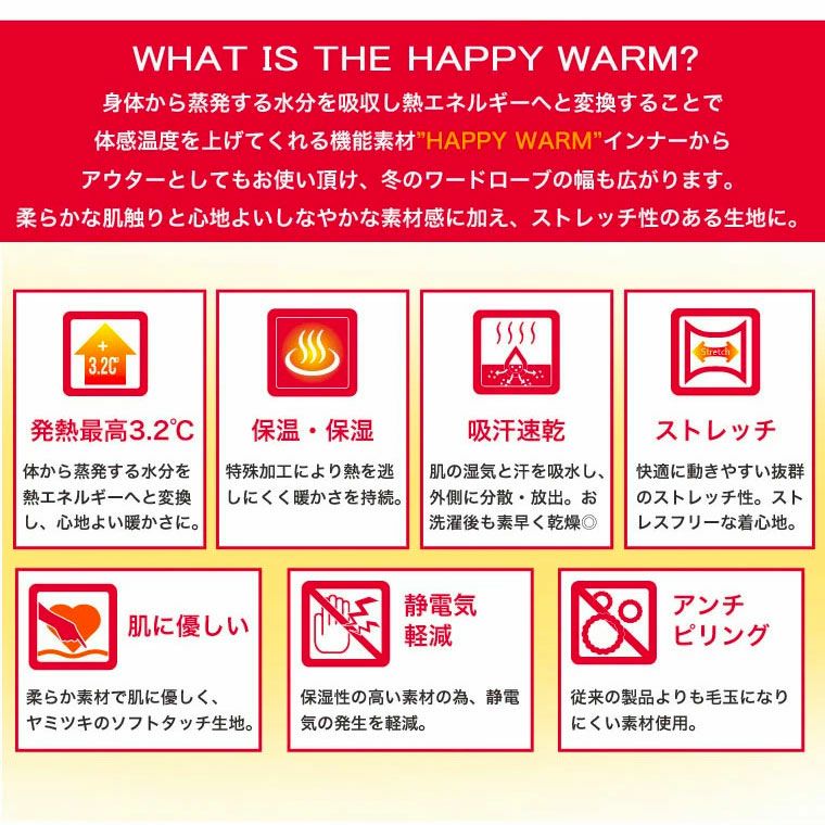 他の画像を見る オリジナル あったか 暖かい ぽっちゃり LL 3L 4L 5L 6L 7L 8L 腰周り 胸周り サイズ 新色追加!! HAPPY WARM お肌に優しい 嬉しい7つの機能/発熱/保温・保湿/吸汗速乾!! HEAT天竺 タートルネック 長袖 カットソー | 大きいサイズの通販ならハッピーマリリン 価格 ¥ 2,190 税込 4.28 在庫切れ お気に入りに登録する