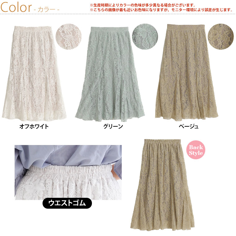 グリーンを購入。 レース感と色味がすごく可愛いです! 裏地がもう少し長さがあるともっと良かったです。
