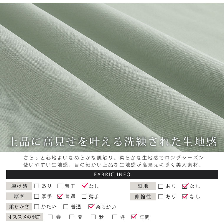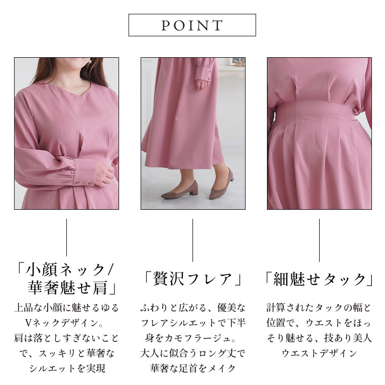 ウエストのタックでスタイルアップ効果抜群のワンピースです。襟ぐりは大きく開きすぎないVネックでスッキリ見えかつ、前屈みになっても安心な仕様にしました。一枚着るだけでで上品レディの完成です。