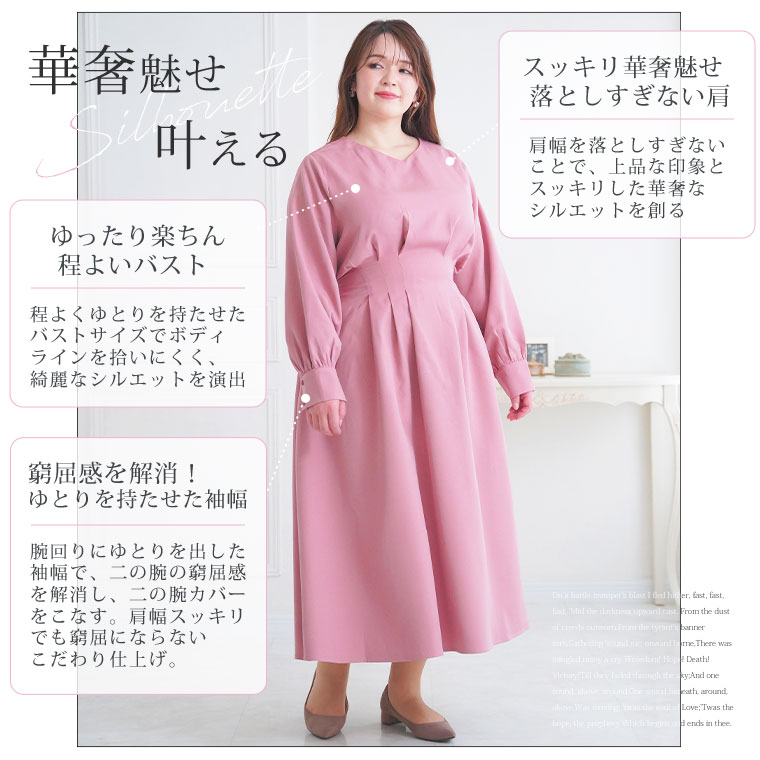 オリジナル ワンピ デザインワンピ LL 3L 4L 5L 6L 春 春物 春服 ゆったり 胸周り 二の腕カバー お尻 腰周り 長袖 【ラファモプロデュース】 【kaorisuちゃん】 ウエスト美人 タックデザイン ロングワンピース lafarfa