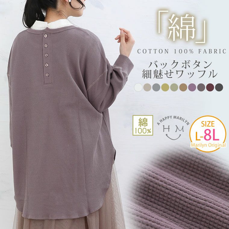 ぽっちゃりさんに嬉しい!柔らかさらりバックボタンワッフルトップス
