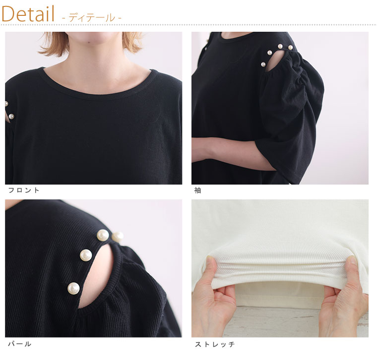 カットソー プルオーバー LL 3L 4L 夏 夏物 夏服 夏用 ぽっちゃり ゆったり ボリュームスリーブ リブ きれいめ 上品 カジュアル ナチュラル プラスサイズ パワショル パール付 トップス