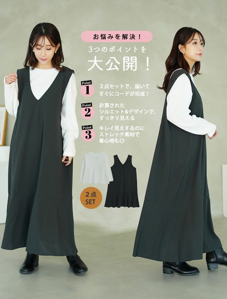 他の画像を見る カットソー LL 3L 4L 5L 6L 7L 8L 秋 秋物 秋服 冬 冬物 冬服 お腹 お尻 新色追加!! スポッと着られる!! ”楽かわ”シリーズ! 長袖 トップス × シンプル ジャンスカ 2点セット | 大きいサイズの通販ならハッピーマリリン 小柄さん丈有 価格 ¥ 3,290 税込 4.35 お気に入りに登録する