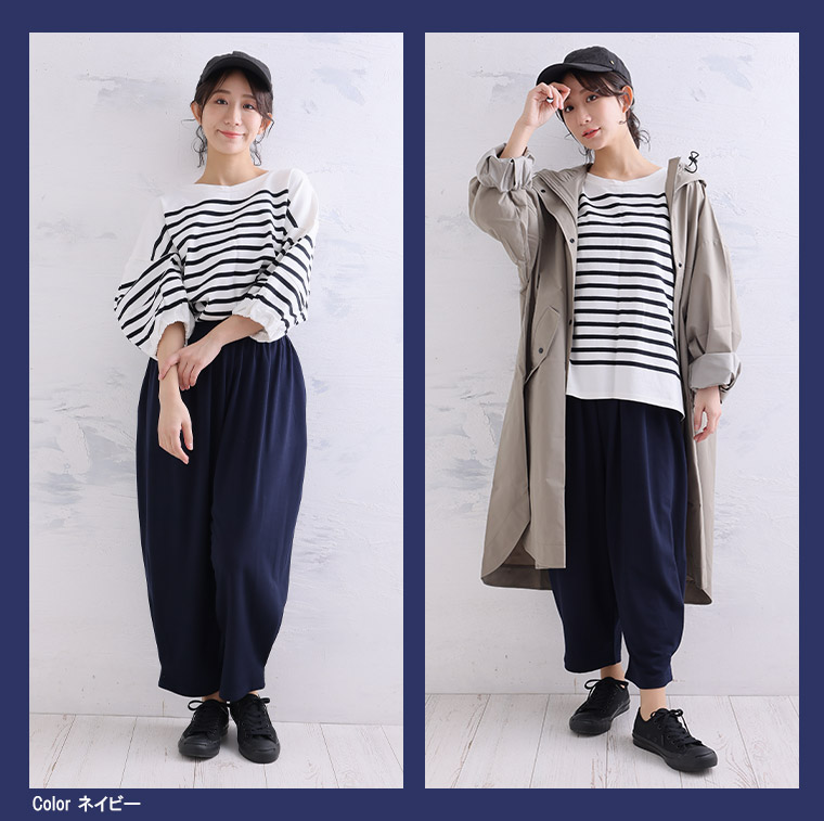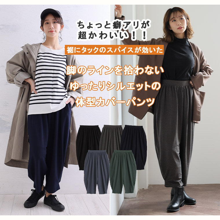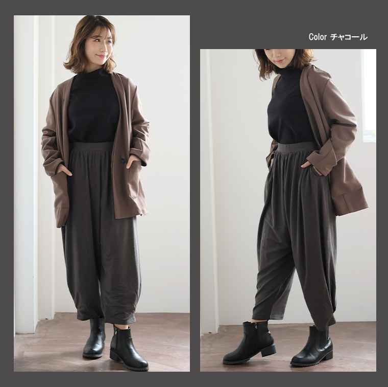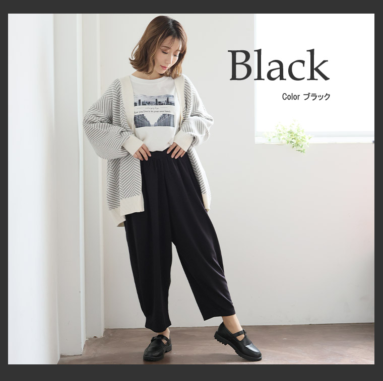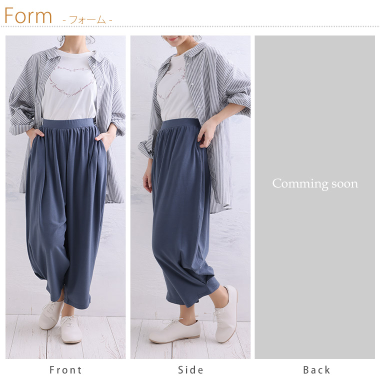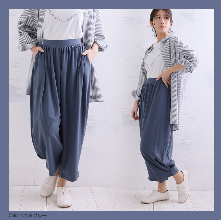 ■着用感:ちょうどいい、■着丈:足首、■バスト:-、■腕回り:-、■袖口:-、■袖丈:-、■首回り:-、■ウエスト:ぴったり、■ヒップ:ちょうどいい、■太もも:ちょうどいい ●ゆとりがありストレスフリーな着心地です。ウエストはしっかりフィットするのでずり落ちません。生地も柔らかく肌触りがとても良いです。