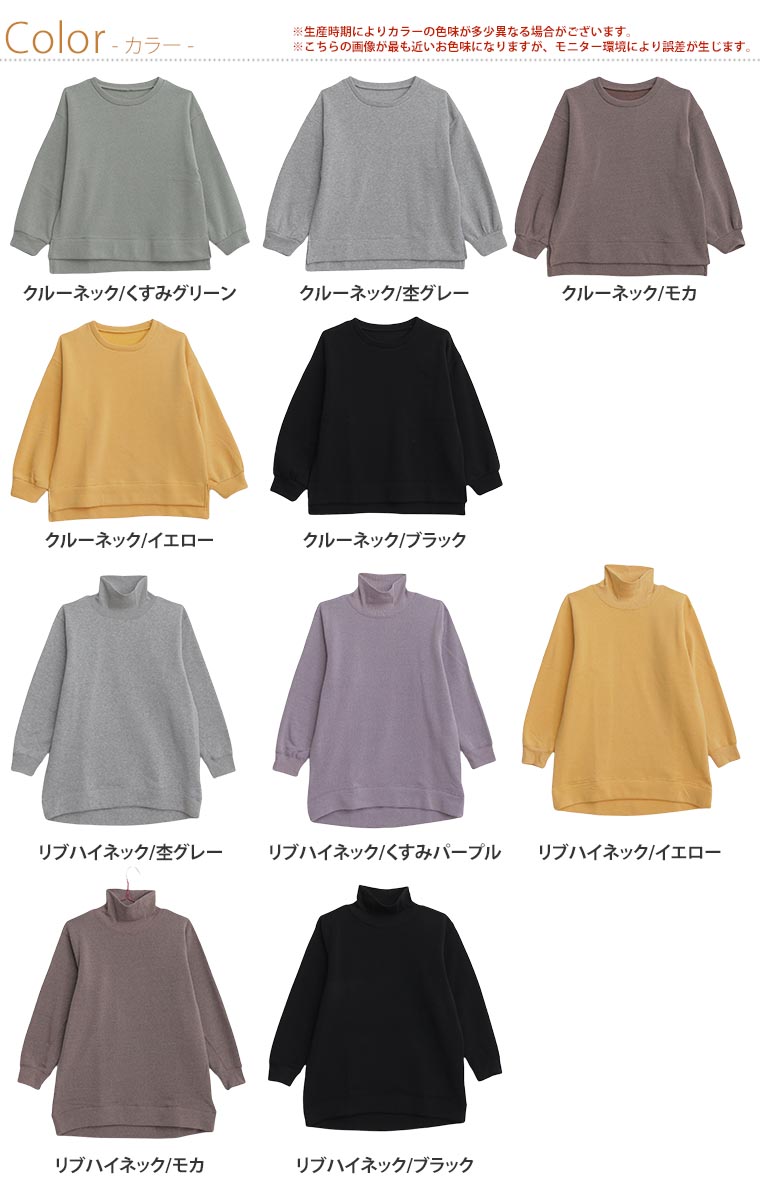 杢グレー・イエローのデザイン違いを購入しました。ハイネックの方は首元の生地が柔らかく薄手でヤボったくなくて良かったです。クルーネックは着丈が短めですがフランネルスカートなどに合うかもしれないと個人的に思いました。かわいいスウェットをありがとうございました。
