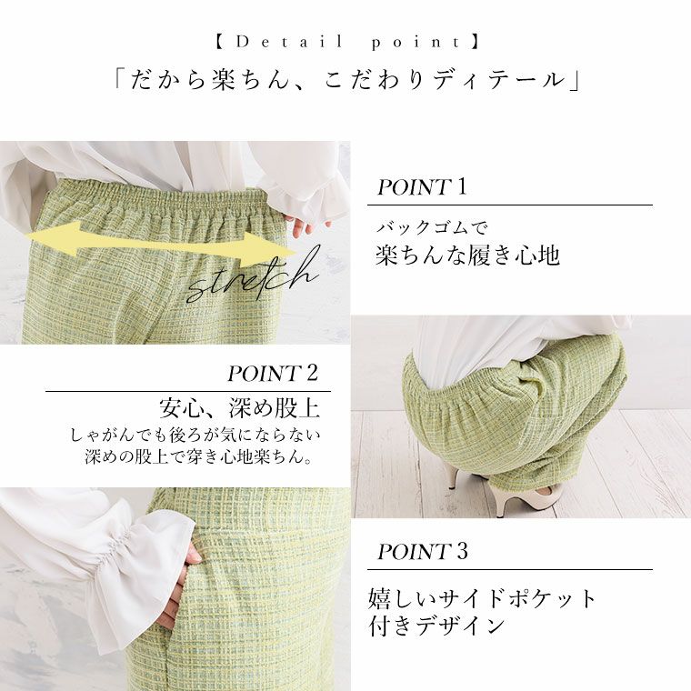 他の画像を見る ボトムス LL 3L 4L 5L 春 ぽっちゃり ゆったり リン 上品 プラスサイズ Rin 上品に華やぐ ファンシーツイード パンツ オフィス 大人 着やせ 体型カバー ビジネス 通勤 ママ セレモニー 【セレモニー】 | 大きいサイズの通販ならハッピーマリリン 価格 ¥ 3,990 税込 3.00 お気に入りに登録する