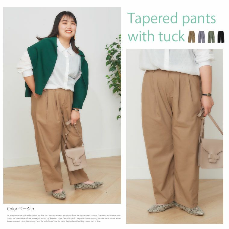 他の画像を見る オリジナル ボトムス LL 3L 4L 5L 6L 秋 秋物 秋冬 ぽっちゃり ゆったり かわいい おしゃれ カジュアル ナチュラル プラスサイズ 涼しげ 綿麻混 【アンバサダー maruさん コラボ】タック テーパードパンツ | 大きいサイズの通販ならハッピーマリリン 価格 ¥ 3,490 税込 4.13 在庫切れ お気に入りに登録する