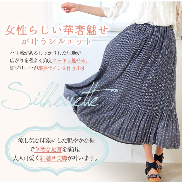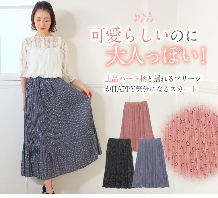 スカート プリーツスカート ボトムス LL 3L 4L 夏 夏物 夏服 夏用 ぽっちゃり かわいい おしゃれ デシンハート柄プリント 86丈 消しプリーツスカート ロング丈