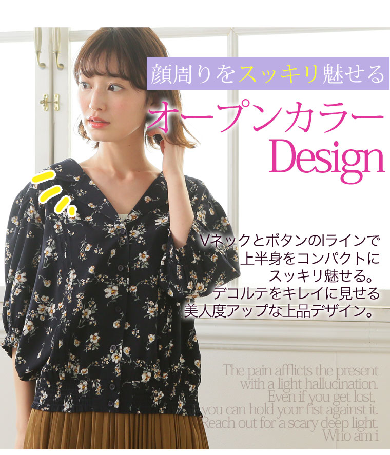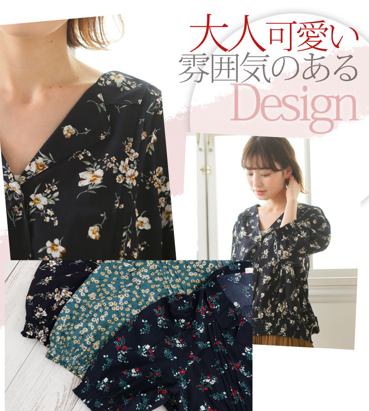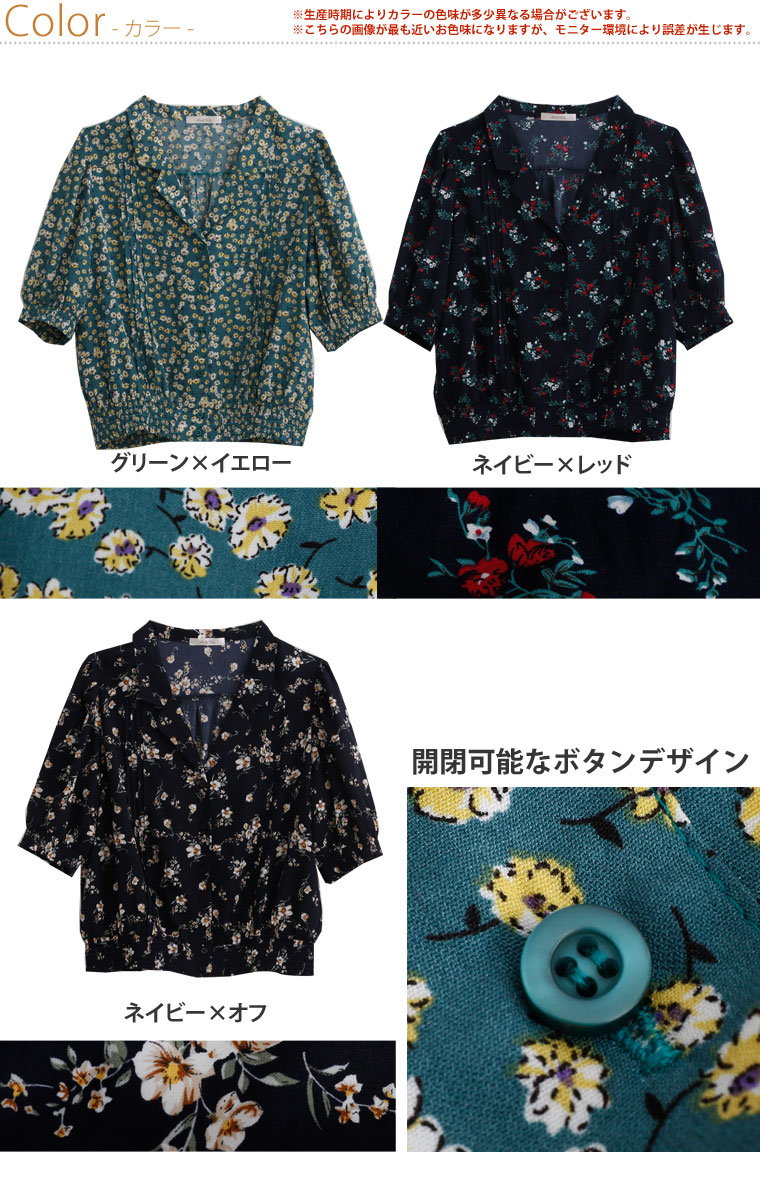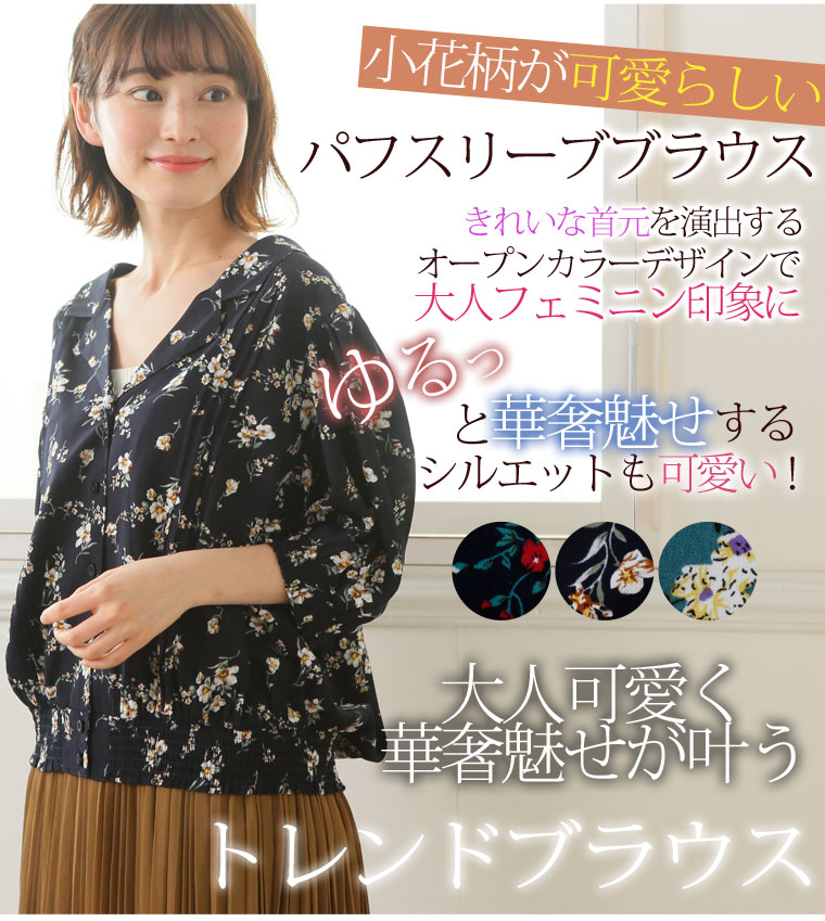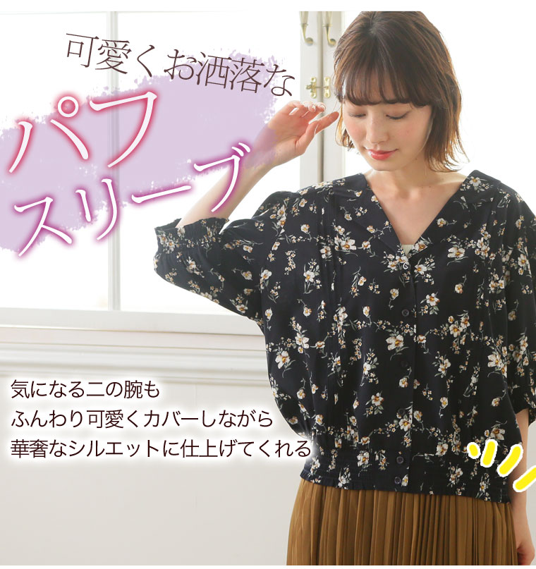ピンタック使い 小花プリントデシン パフスリーブ開襟ブラウス