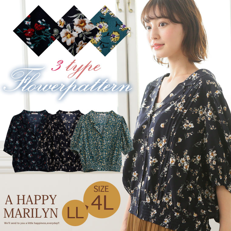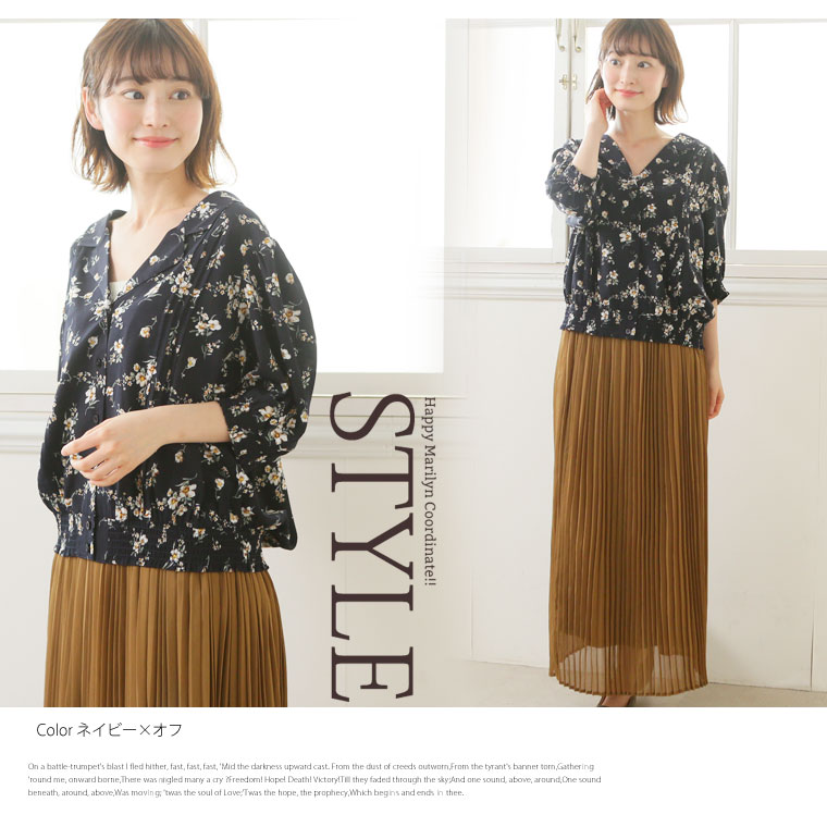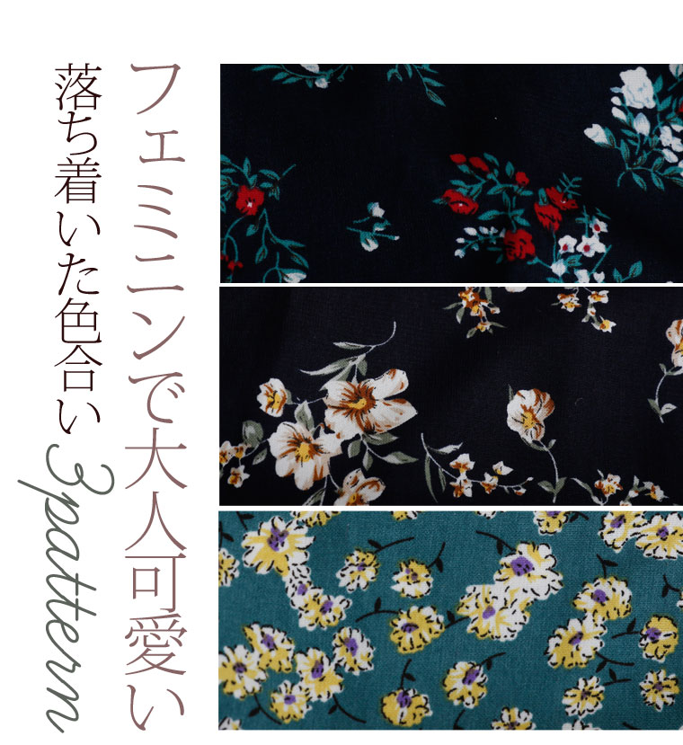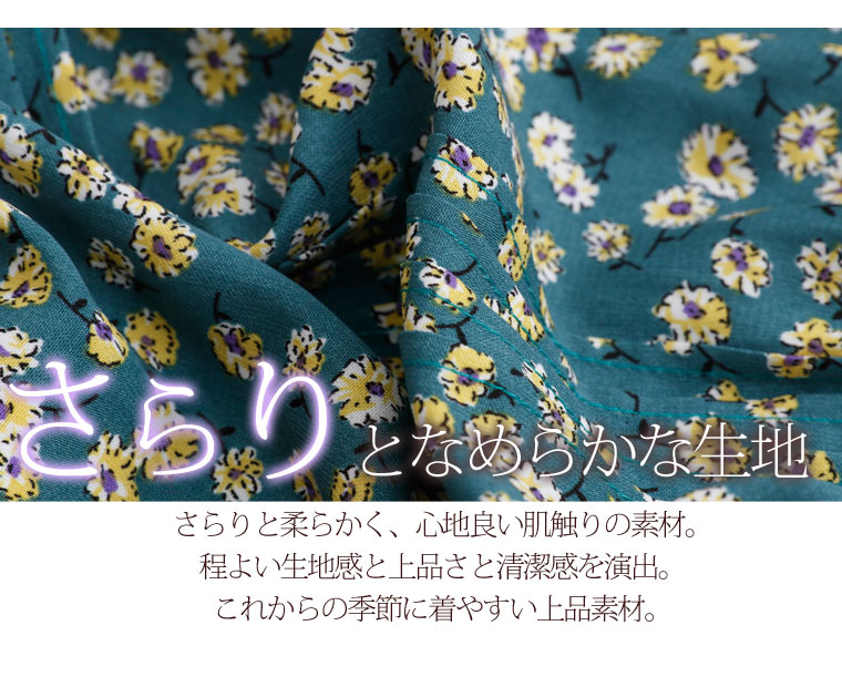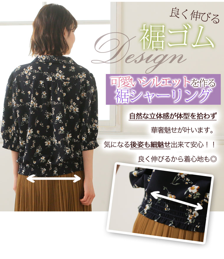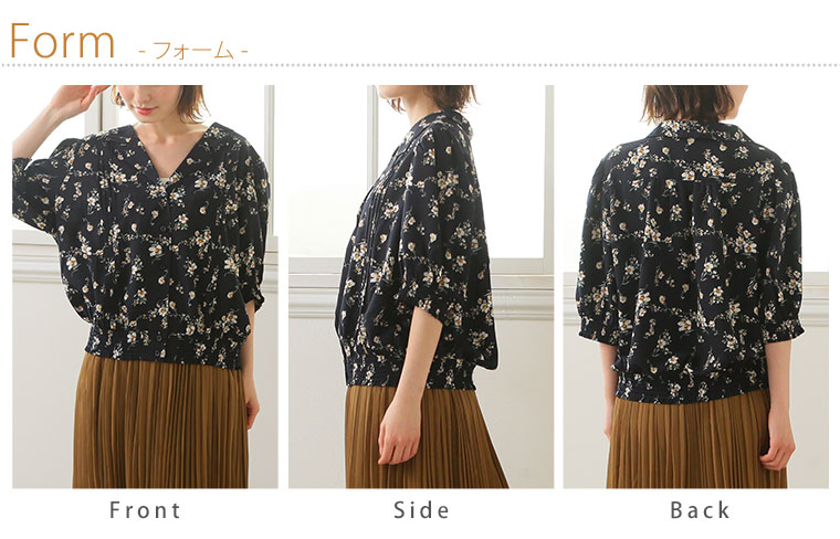 ピンタック使い 小花プリントデシン パフスリーブ開襟ブラウス