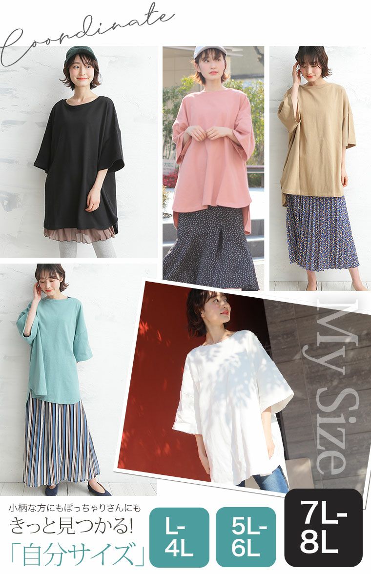 他の画像を見る オリジナル トップス LL 3L 4L 5L 6L 7L 8L 9L 10L 春 春物 春服 夏 夏物 夏服 ぽっちゃり ゆったり お腹 胸周り 二の腕カバー お尻 腰周り 【綿100%シリーズ】 片スリット チュニック Tシャツ | 大きいサイズの通販ならハッピーマリリン 価格 ¥ 1,490 税込 4.00 在庫切れ お気に入りに登録する