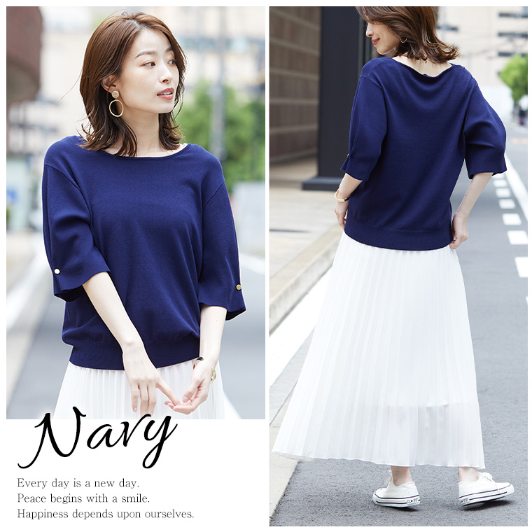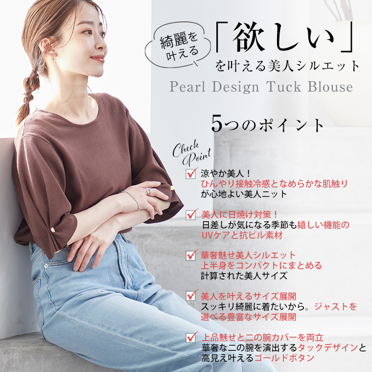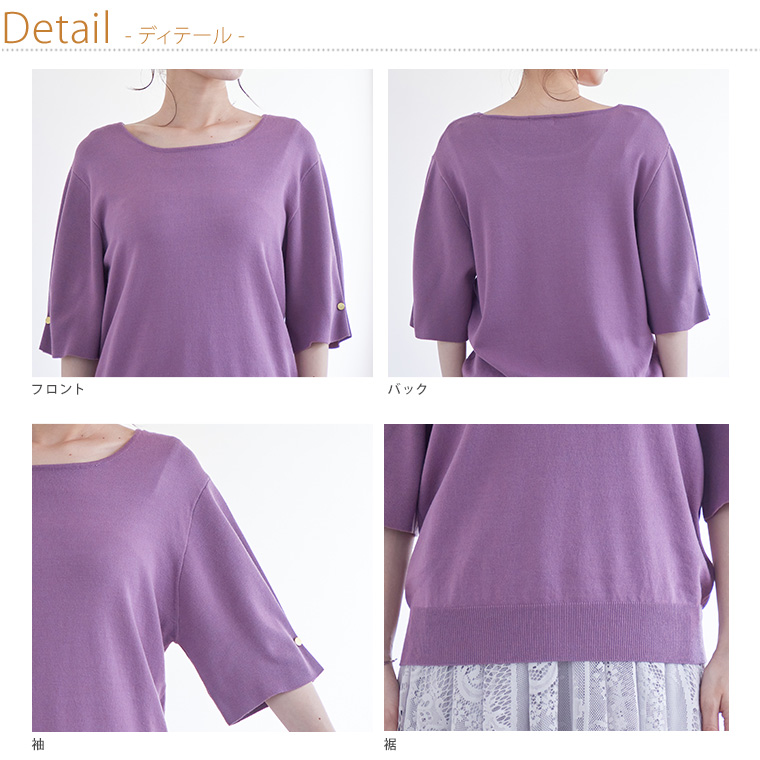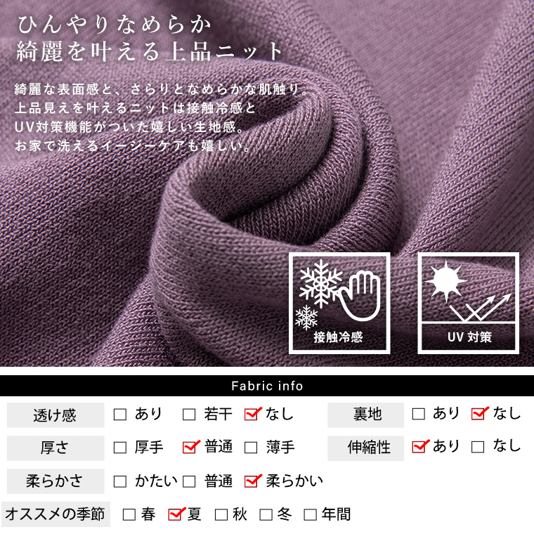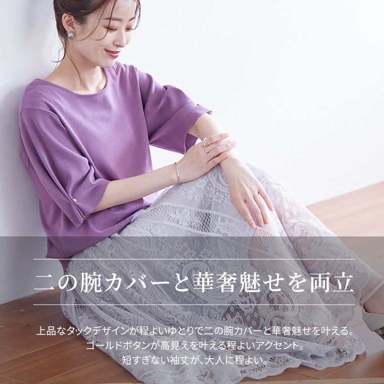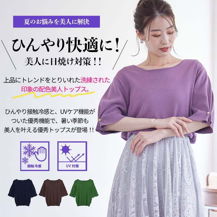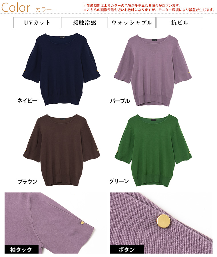 ひんやり接触冷感UV洗える12G金釦付袖タックニットプルオーバー