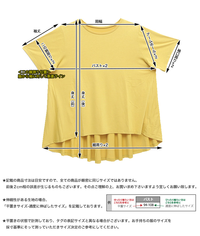 サイズ単位:cm 身丈(前/後) バスト 肩幅 アームホール 二の腕周り 袖丈 袖口周り 裾周り(直線) 素材/透け感
