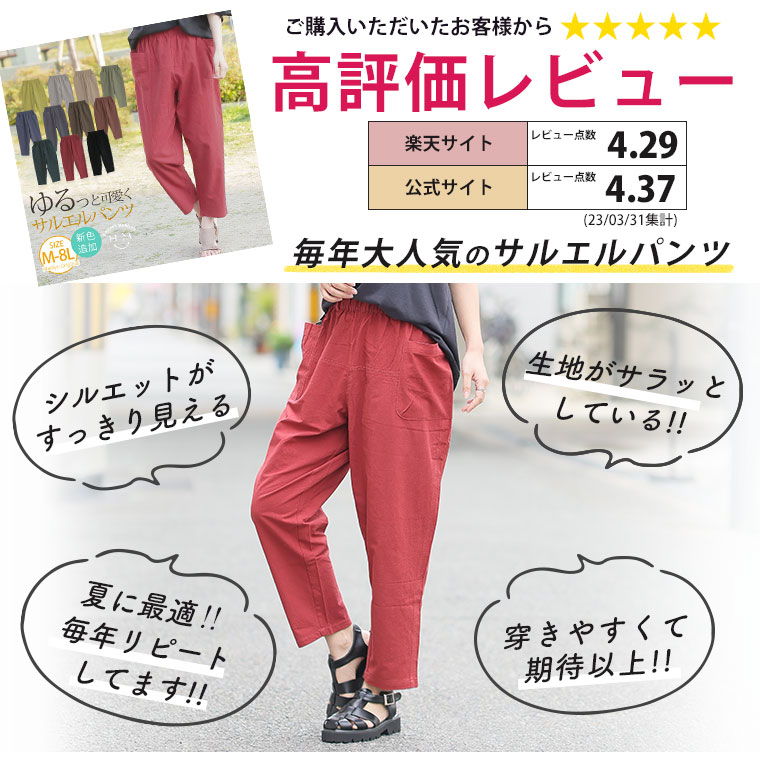 他の画像を見る オリジナル サルエル ボトムス LL 3L 4L 5L 6L 7L 8L かわいい おしゃれ お尻 太もも 新色追加!! コットン100% ウエストゴム+紐 サルエルパンツ【ウェストゴム】 | 大きいサイズの通販ならハッピーマリリン SALE 定価 ¥ 3,290 のところ 価格 ¥ 2,541 税込 4.44 お気に入りに登録する