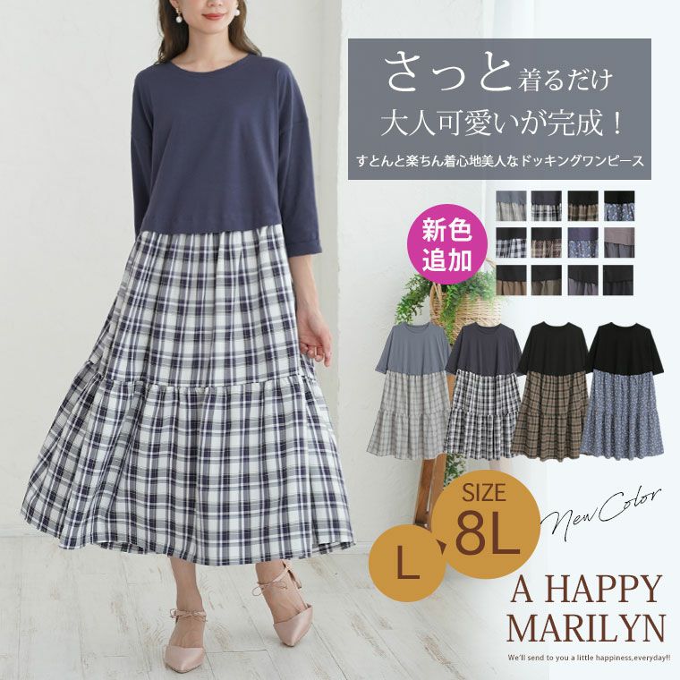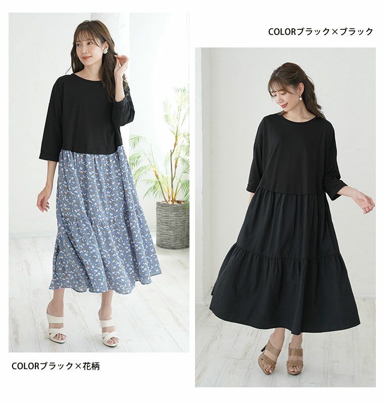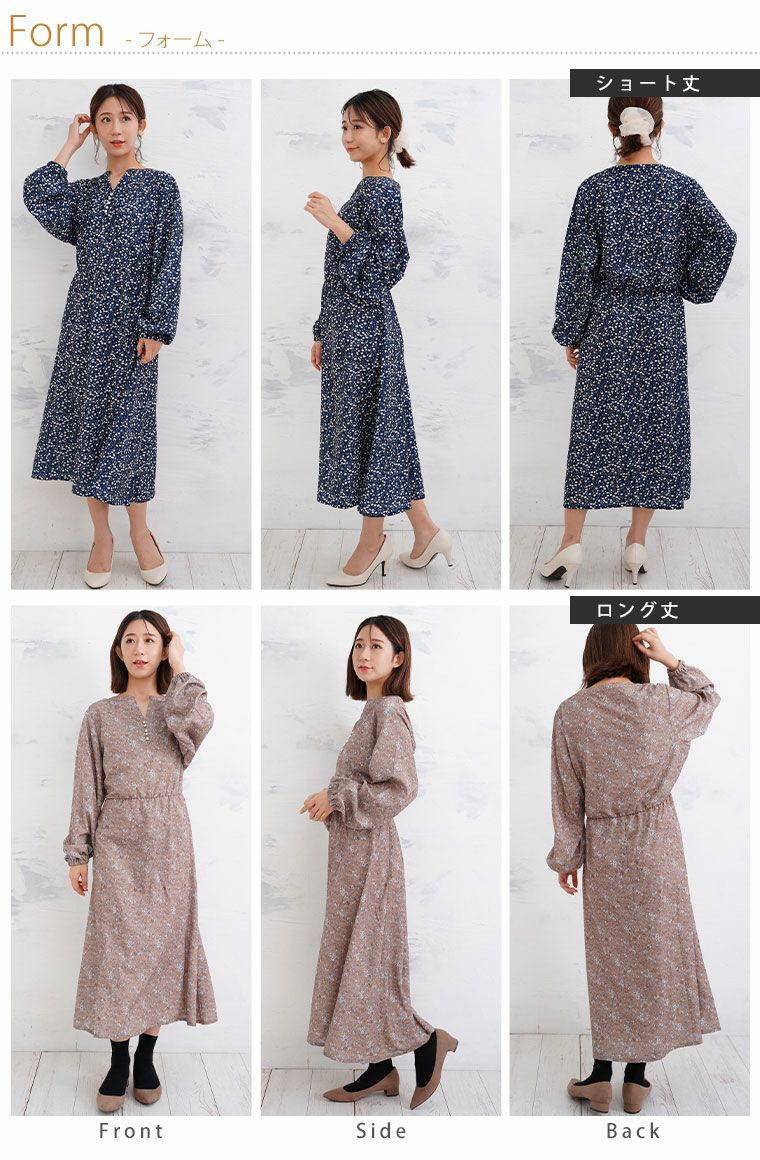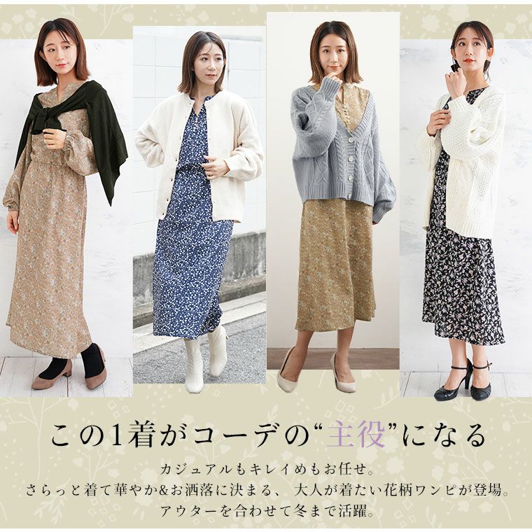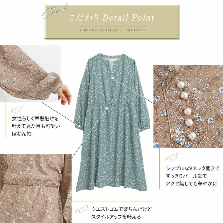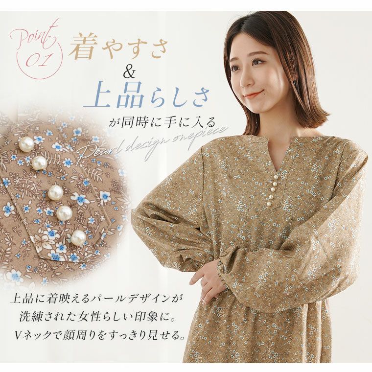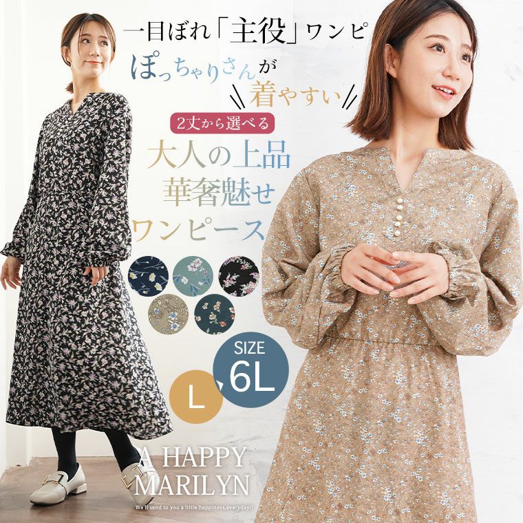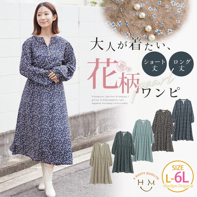 オリジナル ワンピ デザインワンピ LL 3L 4L 5L 6L 秋 秋物 秋冬 ぽっちゃり ゆったり お腹 太もも 二の腕カバー 長袖 花柄 おでかけ フェミニン ぽわん袖 1枚で上品華やか 儚げ パール Aラインワンピース | 大きいサイズの通販ならハッピーマリリン