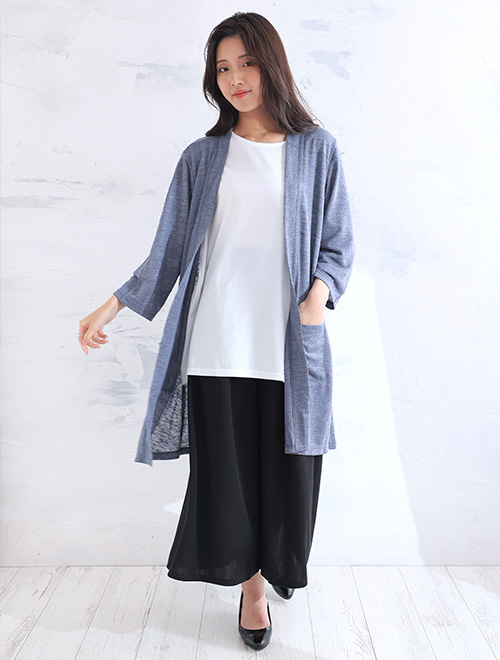 コーデのアクセントになるカラーをセレクトすれば、ロングカーディンガンが作り出すラインに目がいき、自然に身体の横幅をカバーできます。特に、引き締めカラーのブルーは効果てきめん。
