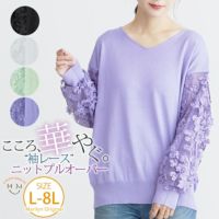 爽やかなミントグリーンの、袖のレースが華やかなニットプルオーバーです。着心地も良く、ゆったりとしています。購入して良かったです。 -