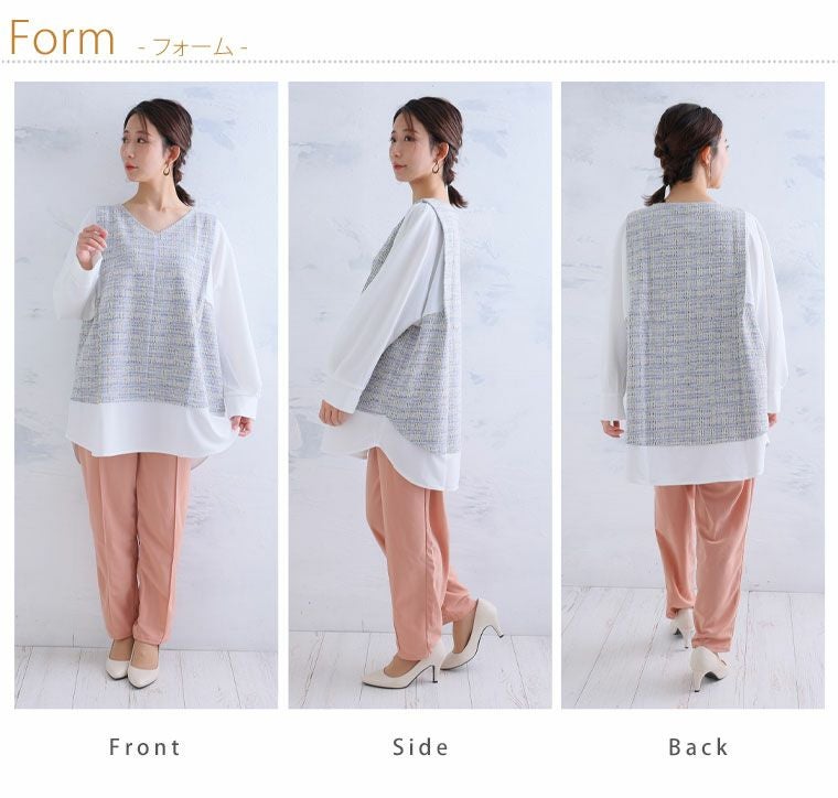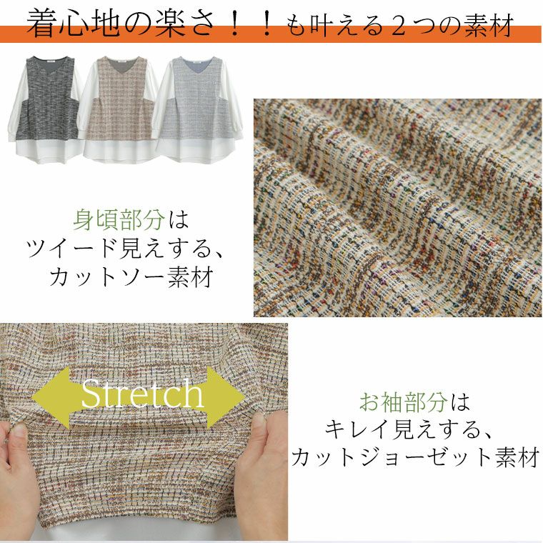他の画像を見る カットソー プルオーバー LL 3L 4L 5L 冬 冬物 冬服 ぽっちゃり ゆったり かわいい おしゃれ カジュアル ナチュラル プラスサイズ フェミニン 春 【MAGICAL LINE】 華奢見え カットツイード ベスト風プルオーバー | 大きいサイズの通販ならハッピーマリリン 価格 ¥ 3,490 税込 3.25 お気に入りに登録する