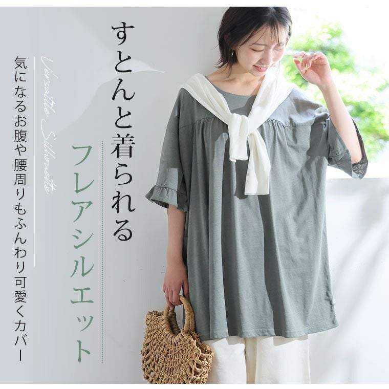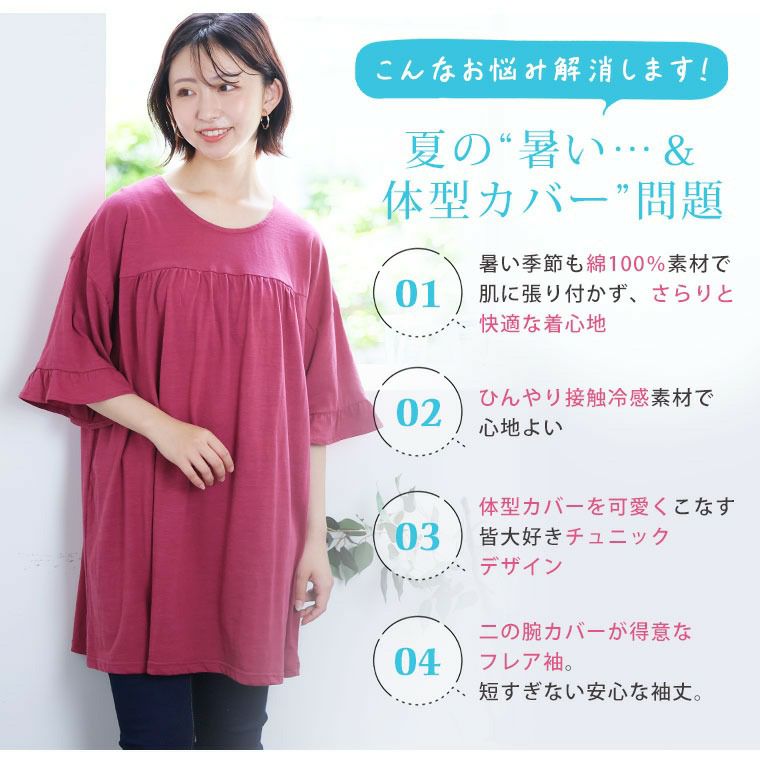 他の画像を見る トップス LL 3L 4L 半袖 五分袖 夏 夏物 夏服 夏用 ぽっちゃり ゆったり プラスサイズ 接触冷感 UV対策 かわいい uv お尻 二の腕カバー 毛玉になりにくい! サラひや カットソー バックフレア チュニック | 大きいサイズの通販ならハッピーマリリン 価格 ¥ 2,490 税込 お気に入りに登録する