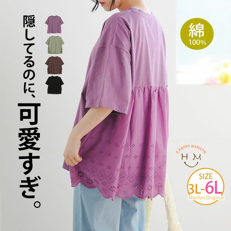 他の画像を見る カットソー 3L 4L 5L 6L 半袖 夏 夏物 夏服 秋 秋物 秋冬 ぽっちゃり ゆったり プラスサイズ かわいい おしゃれ カジュアル ナチュラル ペプラム 綿 お腹 お尻 二の腕カバー お尻もお腹もすっぽり 裾レース Tシャツ | 大きいサイズの通販ならハッピーマリリン 価格 ¥ 2,790 税込 4.33 お気に入りに登録する