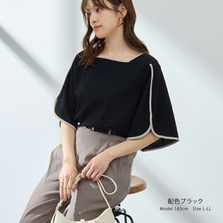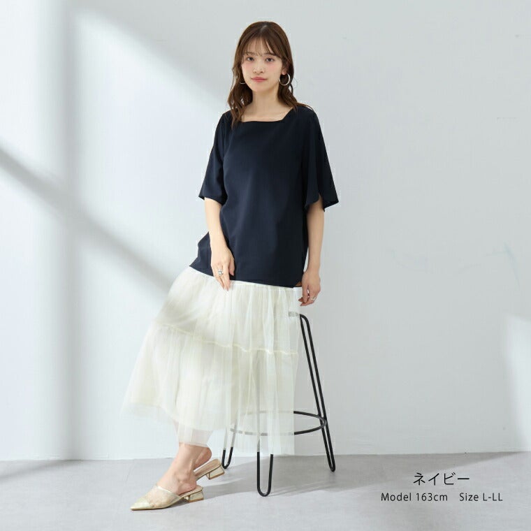 他の画像を見る カットソー LL 3L 4L 5L 6L 五分袖 夏 夏物 夏服 夏用 ぽっちゃり ゆったり プラスサイズ オフィス 大人 着やせ 体型カバー 二の腕カバー Rin バイカラー フレア袖 異素材使い リボン プルオーバー | 大きいサイズの通販ならハッピーマリリン SALE 定価 ¥ 3,490 のところ 価格 ¥ 2,443 税込 3.00 お気に入りに登録する